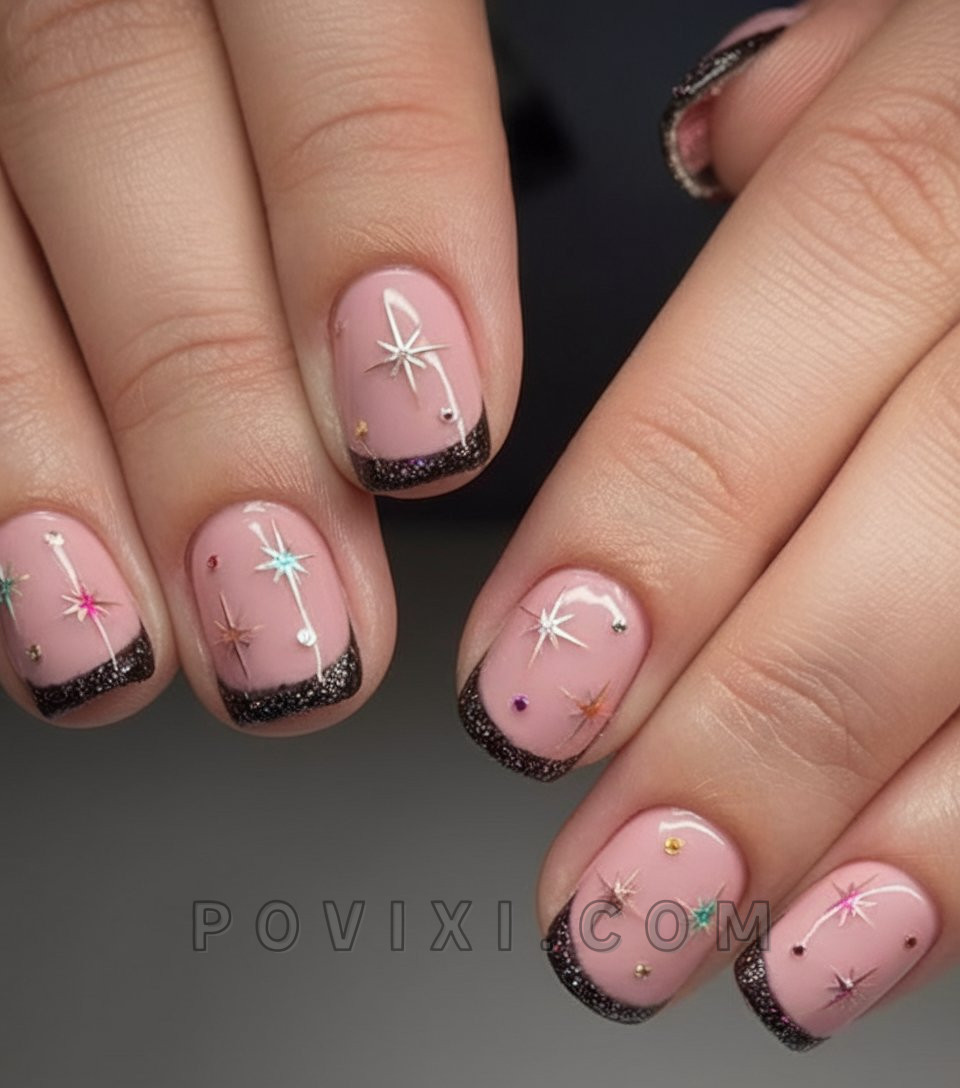 The design exudes cosmic power as it combines black glitter French tips with square nails featuring delicate patterns of stars, moons and orbital shapes on a clear pink background. The design delivers a touch of sparkle and glitter functionality in delicate measures. The hybrid combination of soft sparkle and sophistication makes this design suitable for evening parties and summer celebrations. The design incorporates an astrological style that hits the sweet spot of elegant sophistication.