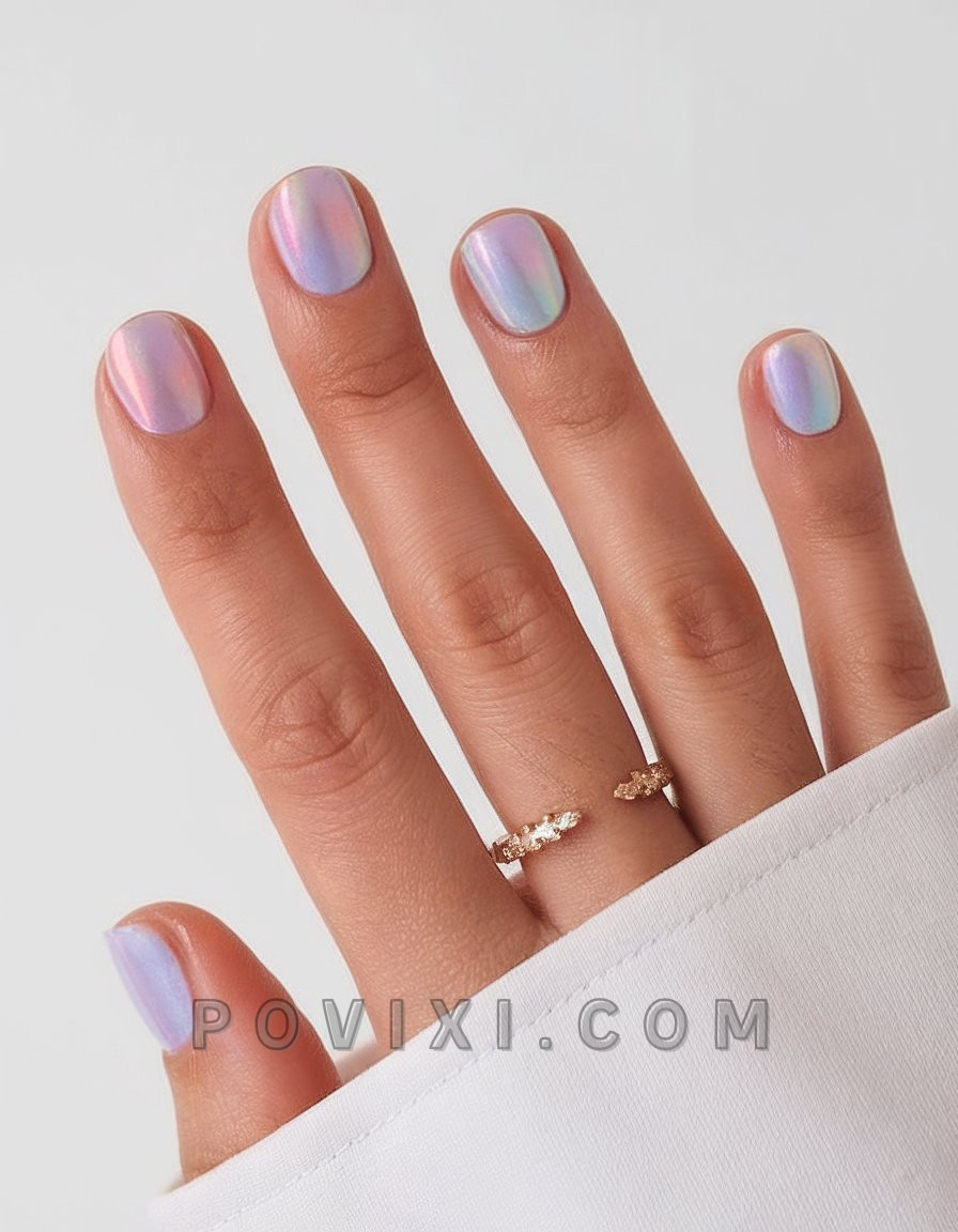 These iridescent pastel nails are part of the big chrome nail trend for 2025. These short oval nails feature vibrant shades of pink, lavender and aqua, just like bubbles in sunlight. The combination of matte and glossy finish creates a perfect shimmer effect. Futuristic yet wearable, these gel nails will be a standout style for summer beaches and pool parties this season.