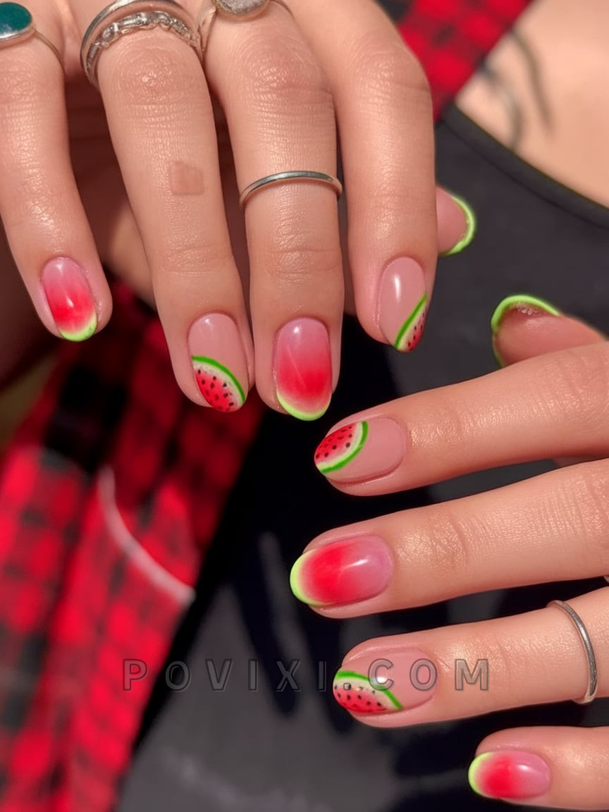 The trendy design captures the beach spirit like a vibrant watermelon-inspired painting. Short, round nails showcase a cheerful combination of gel art and dip nails, featuring vibrant reds that transition to green tips with watermelon seeds scattered on the ends. This design creates a summery vibe with a cheerful look that will instantly grab attention on Instagram. These nails are perfect for barbecues, beach parties or to reflect your fruity personality on any outing.