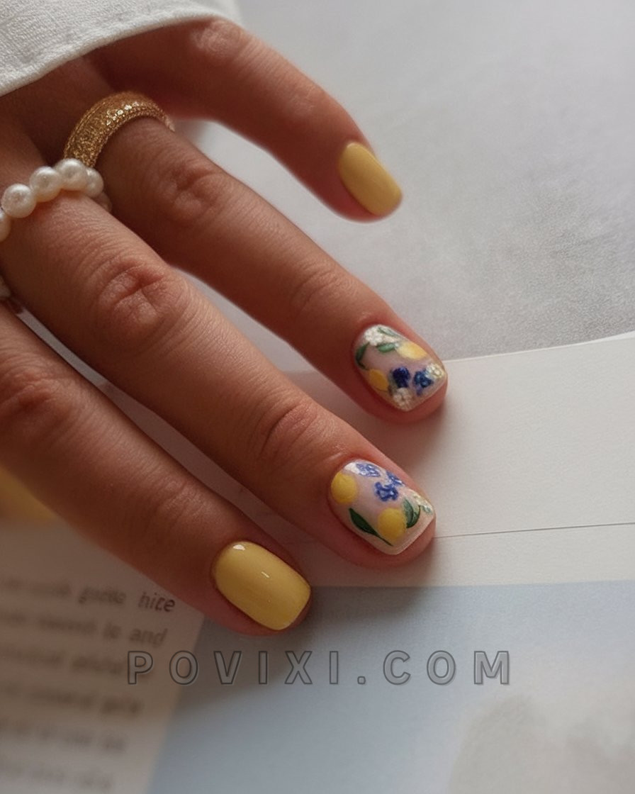 Soft yellow natural nails look spectacular when paired with detailed flowers and sunny blue and lemon elements that adorn the fingers. This nail design combines elements of Tuscan vacation style with cottage fashion to deliver the popular aesthetic of 2025 female preferences. The design uses color combinations and narrative elements to create nails that function as inspirational statement pieces that spark discussion. A matching sundress completes the outfit.