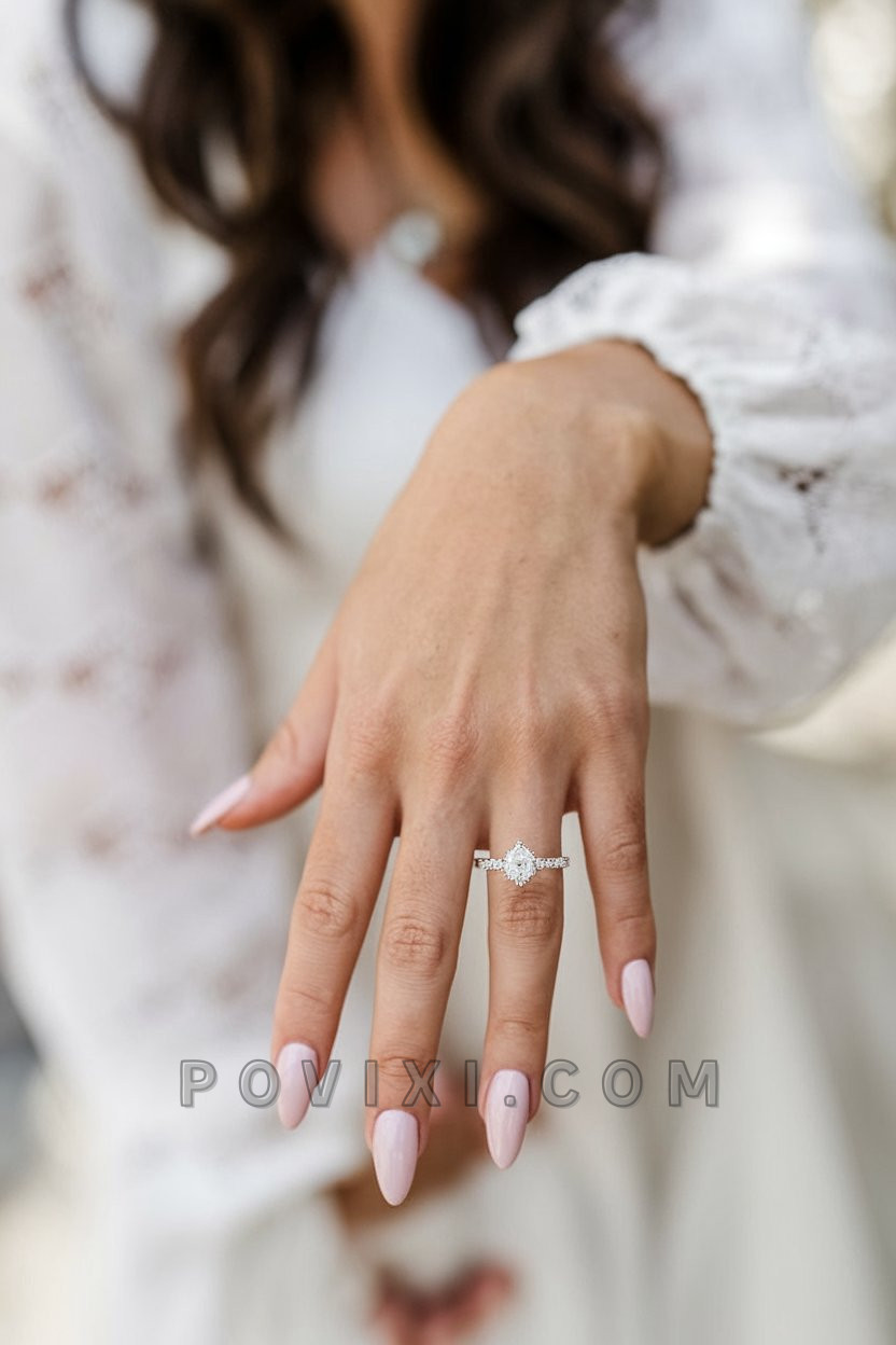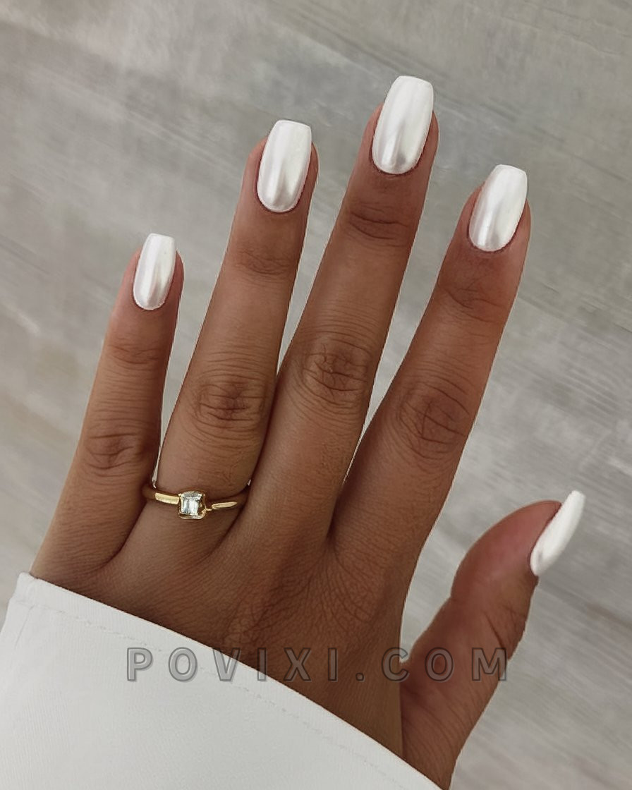 For those who appreciate a timeless and simple beautiful look, this white pearlescent manicure is the ultimate choice. The square shape keeps it modern and fresh, making it suitable for any season—whether you’re celebrating your engagement in fall, winter, or summer. The reflective pearl finish adds a touch of sophistication, ensuring your ring gets the attention it deserves. Pair this with gold jewelry to create a luxurious and refined appearance.