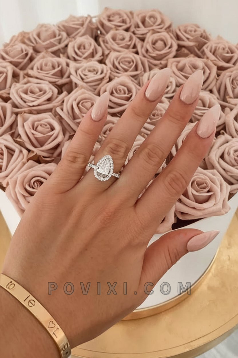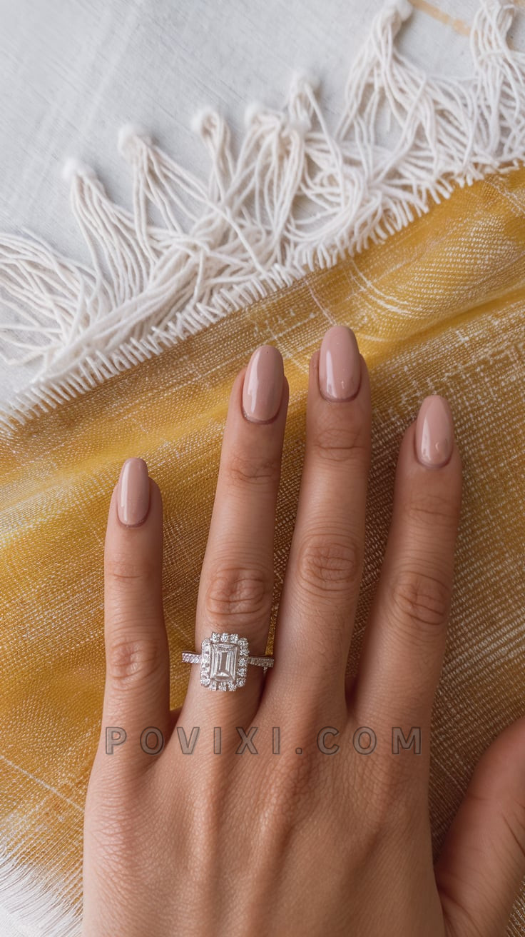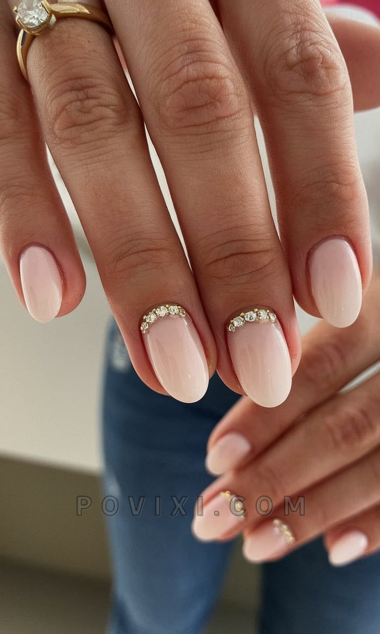 If you prefer a simple yet luxurious nail look, this gel manicure with diamond embellishments along the cuticle is an excellent choice. The neutral pink base allows the small diamonds to shine, creating a subtle sparkle that enhances the beauty of your engagement ring. This design is a favorite for newly engaged women who love understated glamour.