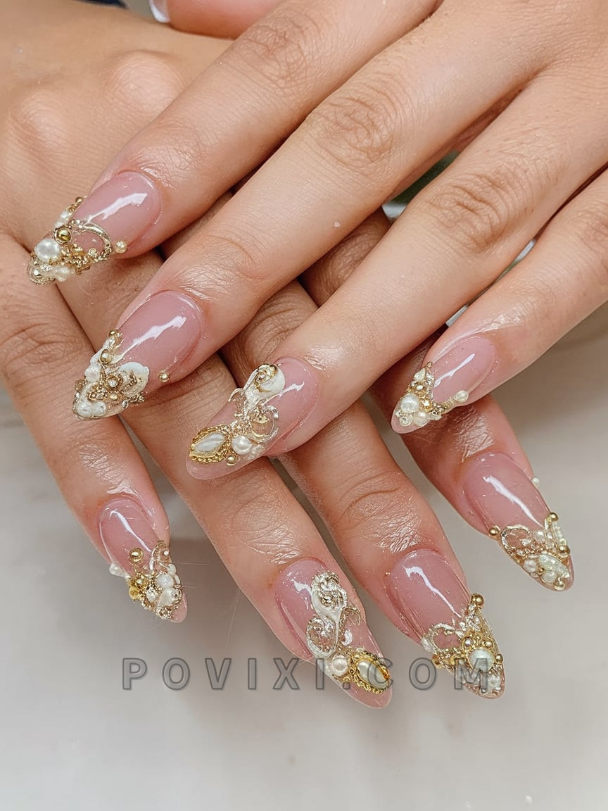 This intricately designed manicure is the epitome of elegance. Featuring gold details, pearls, and delicate embellishments, these nails are perfect for brides who want an artistic yet regal touch. The base is kept sheer and natural, allowing the ornate decorations to shine without overpowering the look. Brides with a vintage-inspired or extravagant wedding theme. This style pairs beautifully with lace, silk, and elegant jewelry. If you want your nails to look as luxurious as your engagement ring, this design is a dream come true.