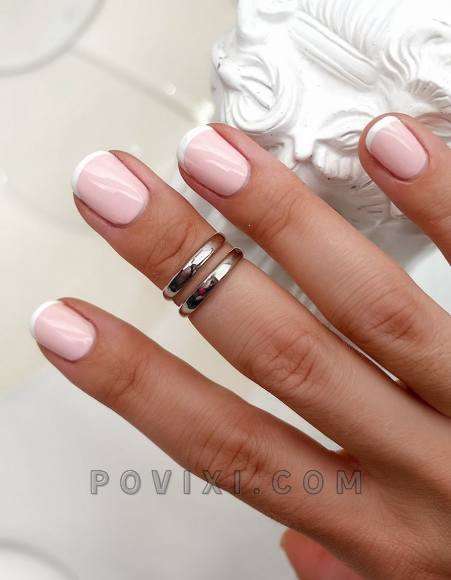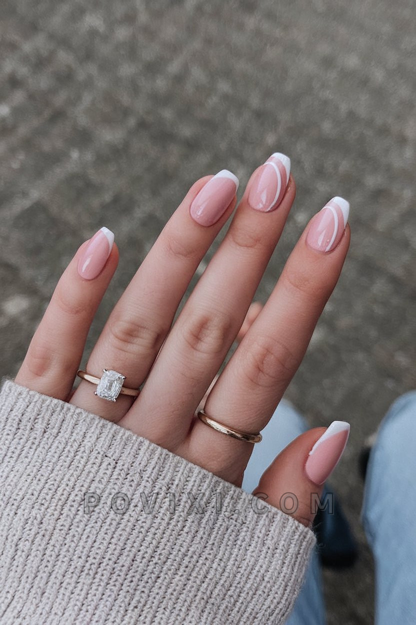 This simple French manicure offers a modern update with curved tips and a square shape, creating a sleek and polished look. The soft pink base enhances the elegance of your engagement ring, making your hands look effortlessly graceful. Whether you’re celebrating in fall or summer, this timeless design never goes out of style.