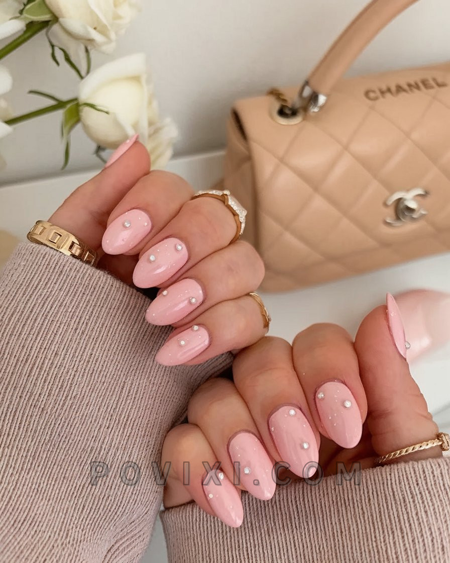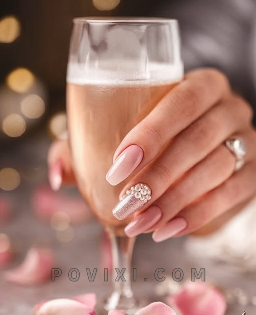 For a bit of sparkle, these almond-shaped nails feature tiny pearls and diamond accents over a soft pink base. The result is a look that feels luxurious yet understated, drawing attention to your engagement ring without overshadowing it. Brides who love subtle elegance with a hint of glam. It’s a perfect look for winter or fall engagements, where cozy and chic styles take center stage.