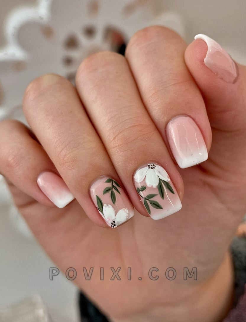 Floral nails are a stunning choice for spring and summer engagements. This design features delicate white flowers and green leaves, painted over a soft nude base. The short square shape keeps the look modern and practical while still feeling incredibly feminine. If you love botanical elements in your engagement look, this nail design is a great way to incorporate them. It pairs beautifully with white dresses and gold jewelry.