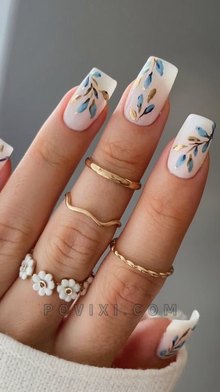 Bringing a bold touch to engagement nails, this square-shaped manicure features an artistic blue and gold leaf pattern. The soft ombré base allows the details to stand out while keeping the overall look elegant. This is ideal for fashion-forward brides who want to break away from the traditional pink and white tones. The gold accents add a luxury feel, making this an excellent choice for fall or winter.