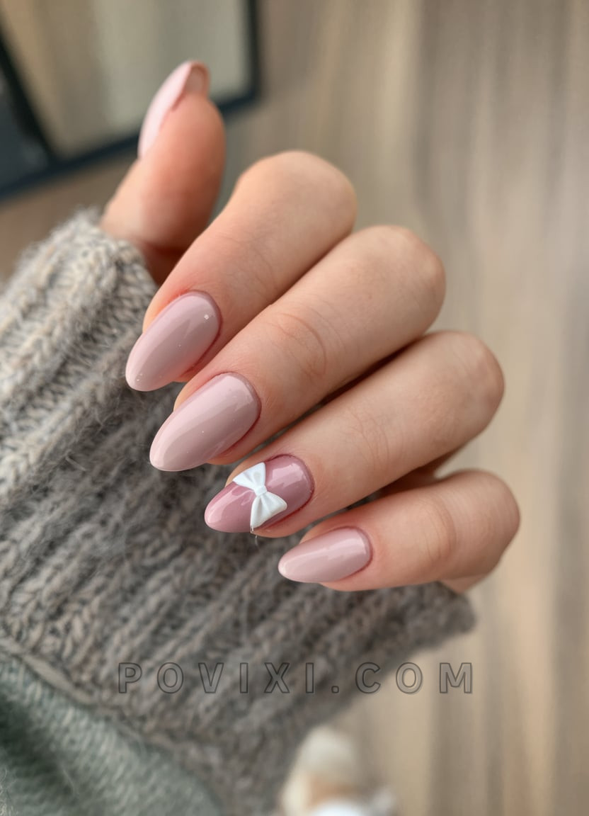 This charming almond-shaped manicure features soft pink polish with a delicate white bow accent on one nail. The result is a dainty, romantic look that’s perfect for newly engaged brides. This design complements delicate engagement rings and soft, feminine fashion styles. It’s great for brides who love a vintage or fairytale-inspired aesthetic.