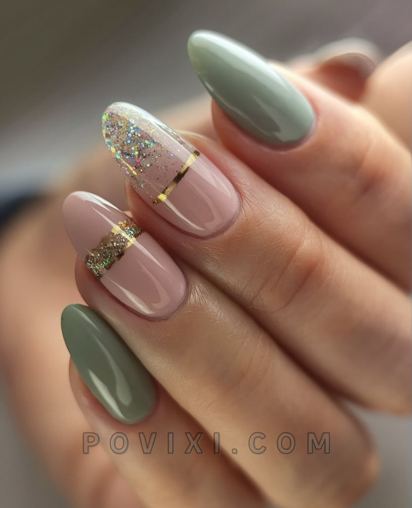 For those looking for a unique yet romantic engagement nail design, this almond-shaped set blends fall-inspired sage green with classic gold foil. The deep, muted green brings an unexpected twist to traditional engagement nails, making them perfect for brides who love earthy tones and elegant, nature-inspired styles. The contrast between the rich green and the soft nude-pink base gives this design a balanced, modern look, while the gold foil creates an opulent touch. Some nails feature a clear base with scattered holographic glitter, adding dimension and sparkle. This manicure works beautifully for engagement parties in fall, as it complements seasonal colors and warm-toned outfits. It’s an excellent choice for nature-loving brides who want their nails to reflect both sophistication and individuality.