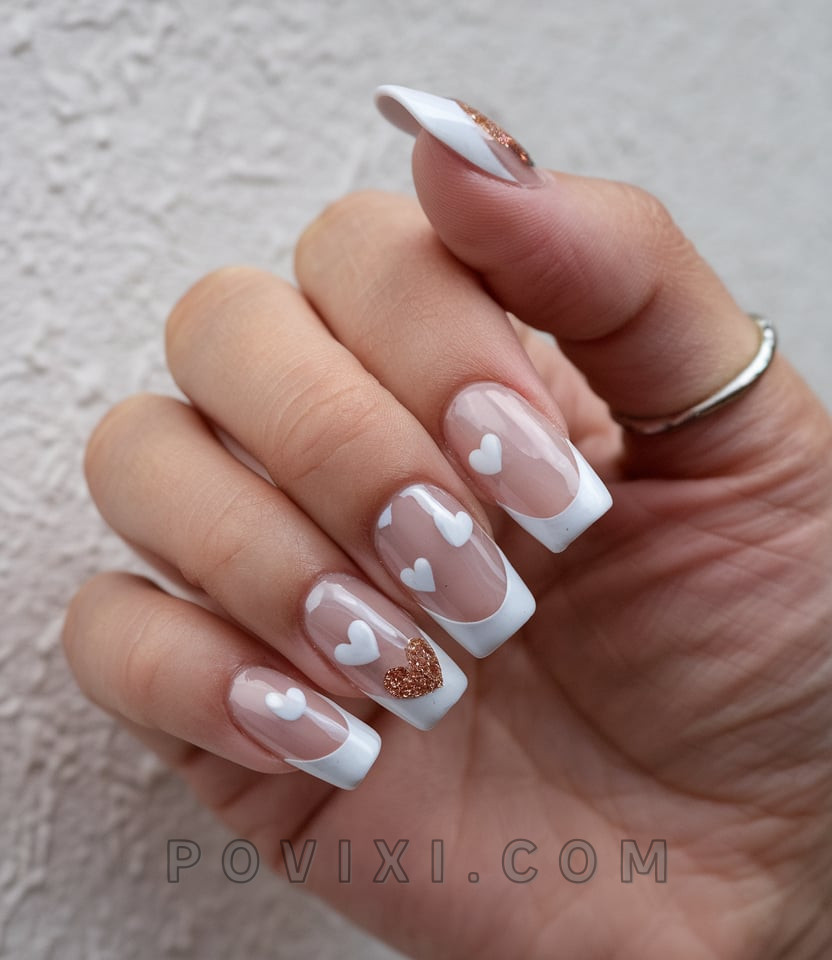 A twist on simple French manicures, this design features crisp white tips on a sheer nude base, adorned with tiny white and gold hearts. Each nail is carefully designed to blend classic and modern elements, making it a great choice for a romantic engagement celebration. One of the standout features is the glittery gold heart on the ring finger, which subtly highlights the importance of this special moment. The crisp square shape enhances the classic nature of the design, while the soft nude base makes it suitable for brides who prefer a delicate and refined look. This style is perfect for a newly engaged bride who loves timeless designs with a playful, heartfelt touch.