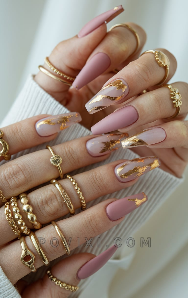 For the modern bride-to-be who loves a bold look, this long almond-shaped design in muted mauve is effortlessly chic. The deep mauve tone is perfect for engagement parties, as it adds a touch of drama without being overpowering. The gold leaf accents create a beautiful contrast, with the irregular placement giving the nails an artistic, handcrafted feel. These gel nails have a luxurious texture, making them ideal for fall engagements where deep, warm colors shine. This manicure pairs exceptionally well with gold engagement rings and statement jewelry, making it a must-have for those who love a rich, stylish aesthetic.