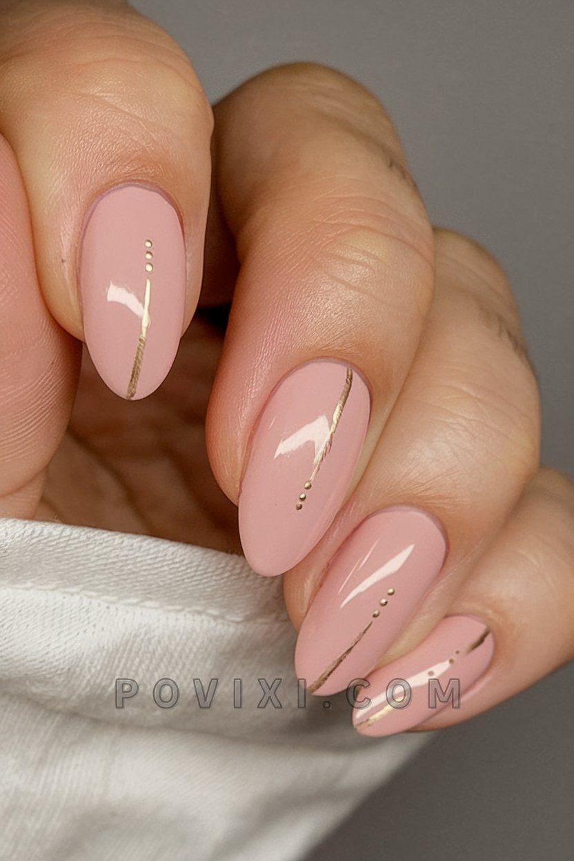 Understated yet refined, these short almond nails feature a soft pink hue with dainty gold lines for a contemporary touch. This design is ideal for those who prefer simple beautiful manicures without sacrificing elegance. The fine, delicate gold accents follow the natural curve of the nail, adding an artistic yet subtle design element. This look is perfect for an intimate engagement setting, where subtle sophistication takes center stage. The muted pink shade blends beautifully with various outfits, making it a top choice for brides-to-be who favor modern elegance.