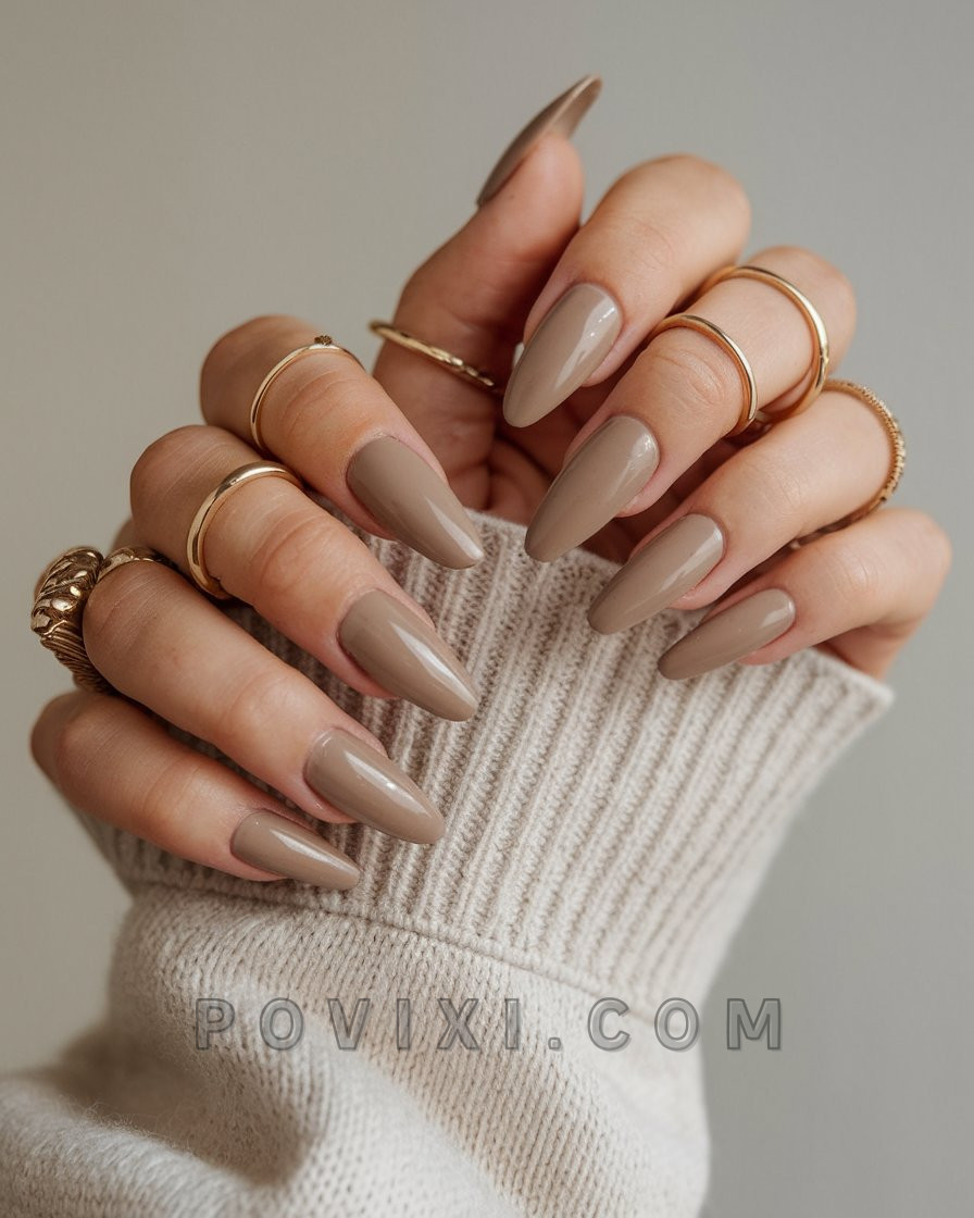 A stunning example of simple beautiful nails, this almond-shaped nude manicure is effortlessly chic. The glossy finish enhances the natural beauty of the hands, creating an understated yet elegant look that blends perfectly with any ring style. This manicure looks stunning with rose gold, platinum, or white gold rings. Its soft neutral tone makes it ideal for everyday wear, ensuring your nails always look polished and refined.