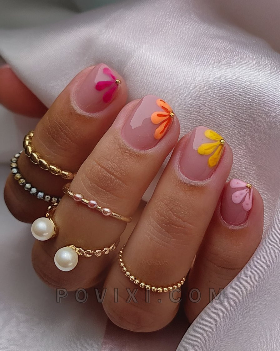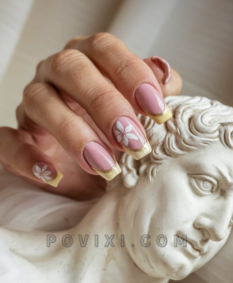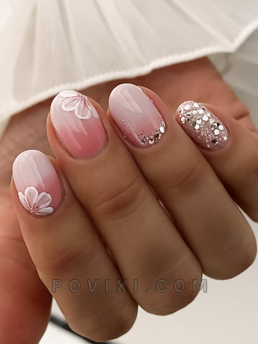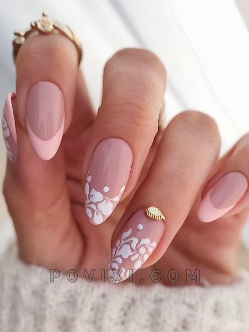 If you’re looking for a fun and charming nail design, this French-inspired style with floral elements and glitter is a fantastic choice. Featuring soft pink and white hues with detailed floral art, this manicure is perfect for brides who want something unique yet delicate. It’s a beautiful balance of classic and contemporary, making it a great option for any engagement season.