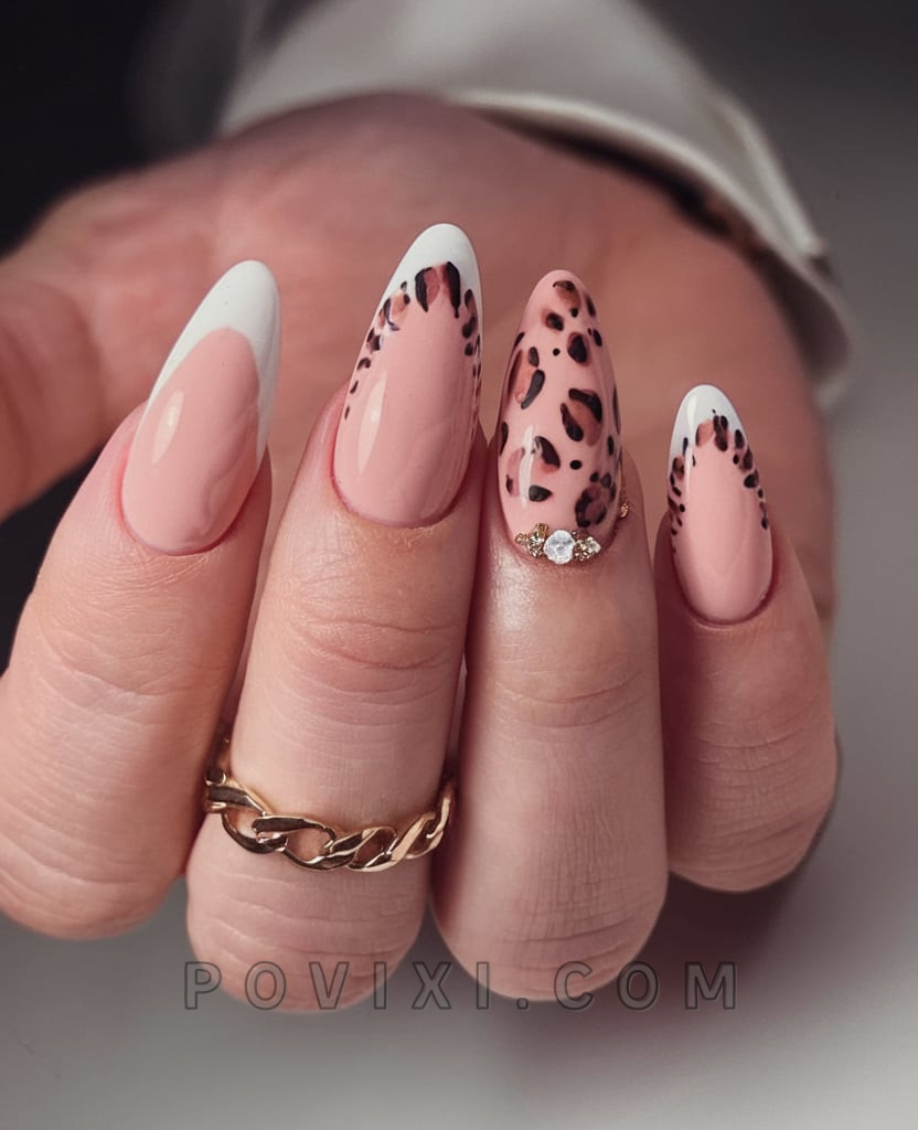 For those who love a mix of classic and daring, this simple French manicure gets an edgy upgrade with leopard print accents. The almond shape creates a sophisticated silhouette, while the gold embellishments add a hint of glamour. This design is perfect for confident brides-to-be who love statement nails that blend elegance with a touch of the wild side.