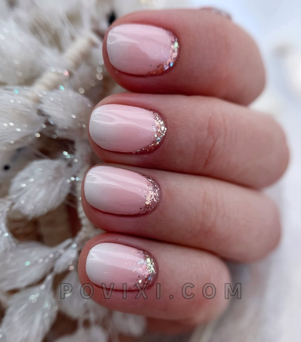 For a delicate and ethereal effect, this ombre design features a soft pink transition into a transparent tip, finished with fine glitter along the cuticle line. This short style is perfect for brides who love simple beautiful manicures that are elegant yet easy to wear. Ideal for fall and winter engagements, this nail art brings a subtle shimmer to your big moment.