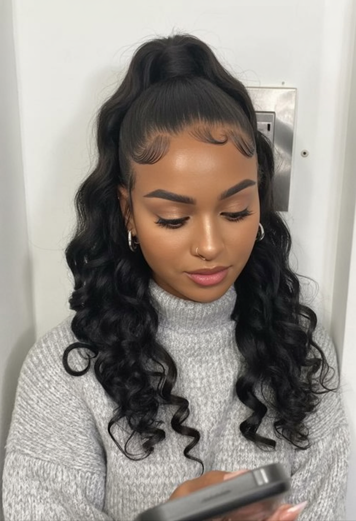 One thing that is difficult to deny is the effortless attractiveness that comes from having a curly hairstyle that’s also a high ponytail, along with having softly cut edges. This type of hairstyle combines both elegance and youth, making it something that can instantly turn an otherwise boring outfit into something that is sleek, chic, and elegant, not to mention something that will definitely turn heads.