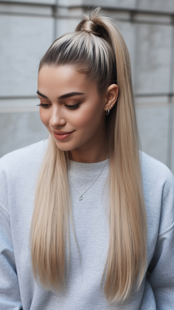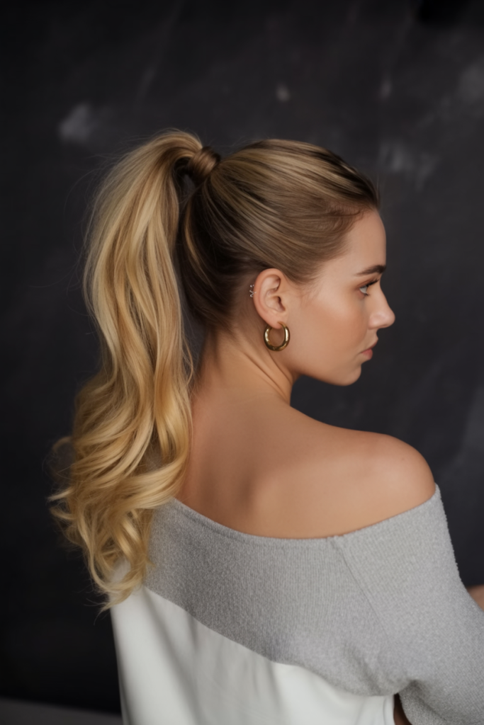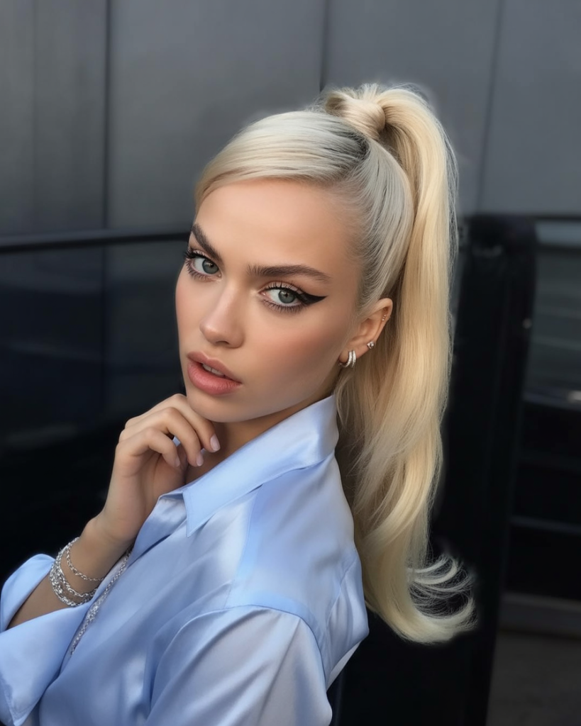 This ponytail combines the best of both worlds—it has both height and motion. The lifted roots provide a nice structure, and then the loose, flowing blonde wave adds a feminine, sweet touch to it. This look is both playful and glamorous, and that is exactly what will make it the absolute highlight of any woman’s hairstyle collection.