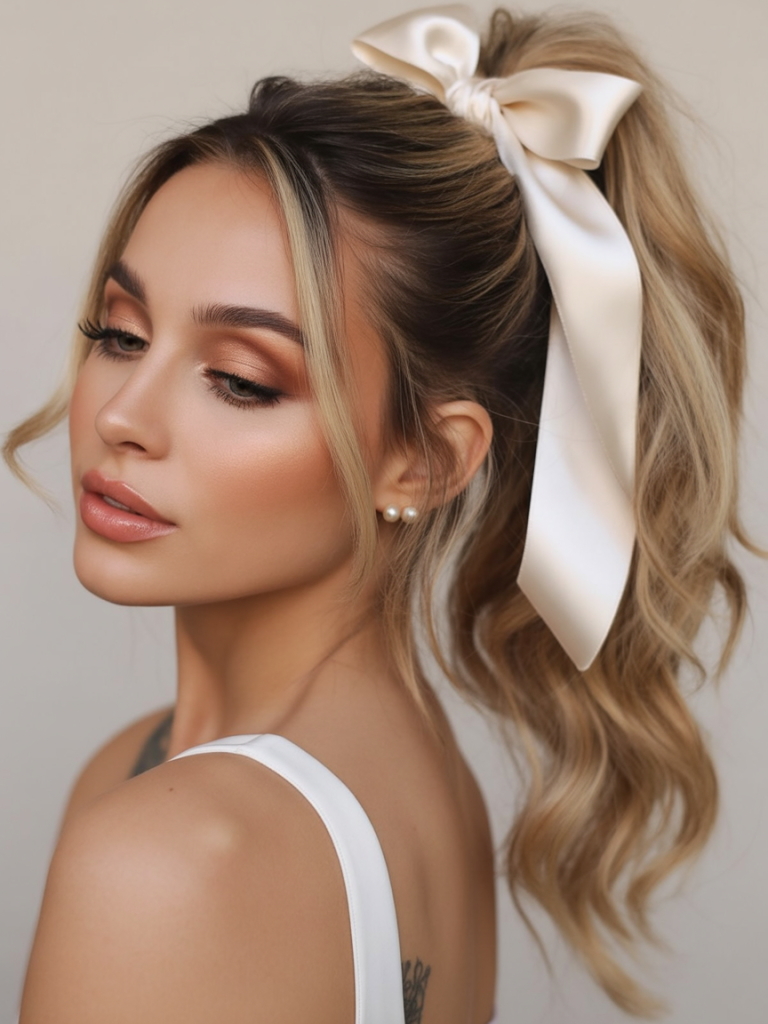 15. Wavy Ponytail with Satin Bow
