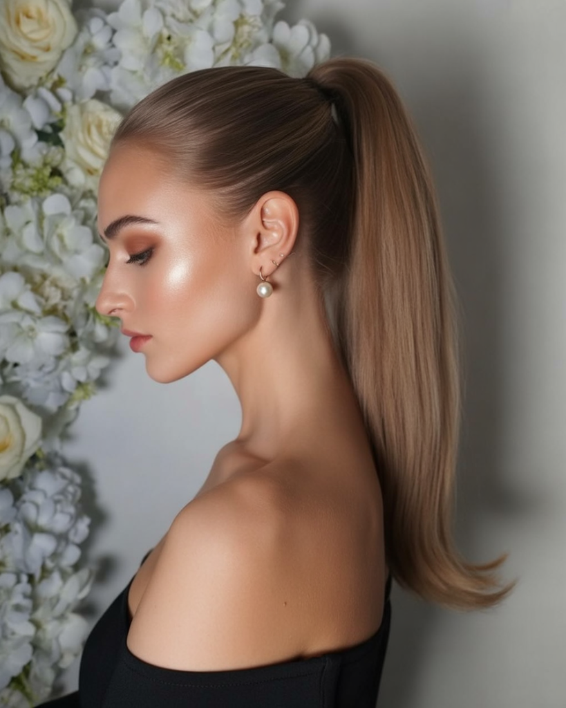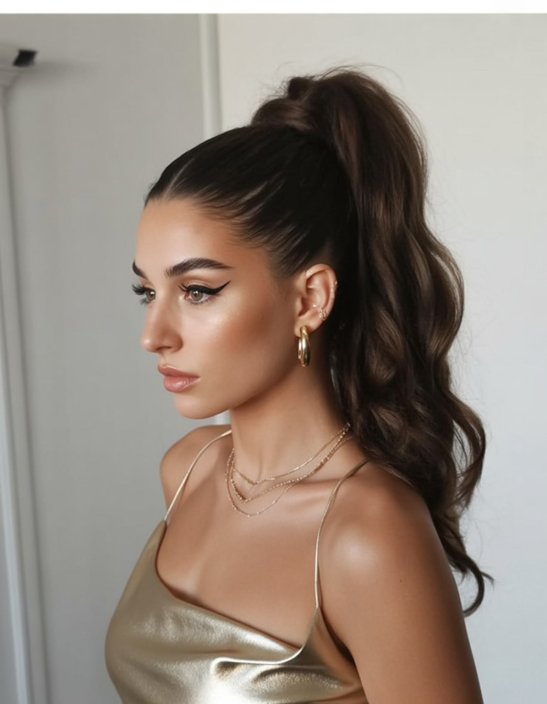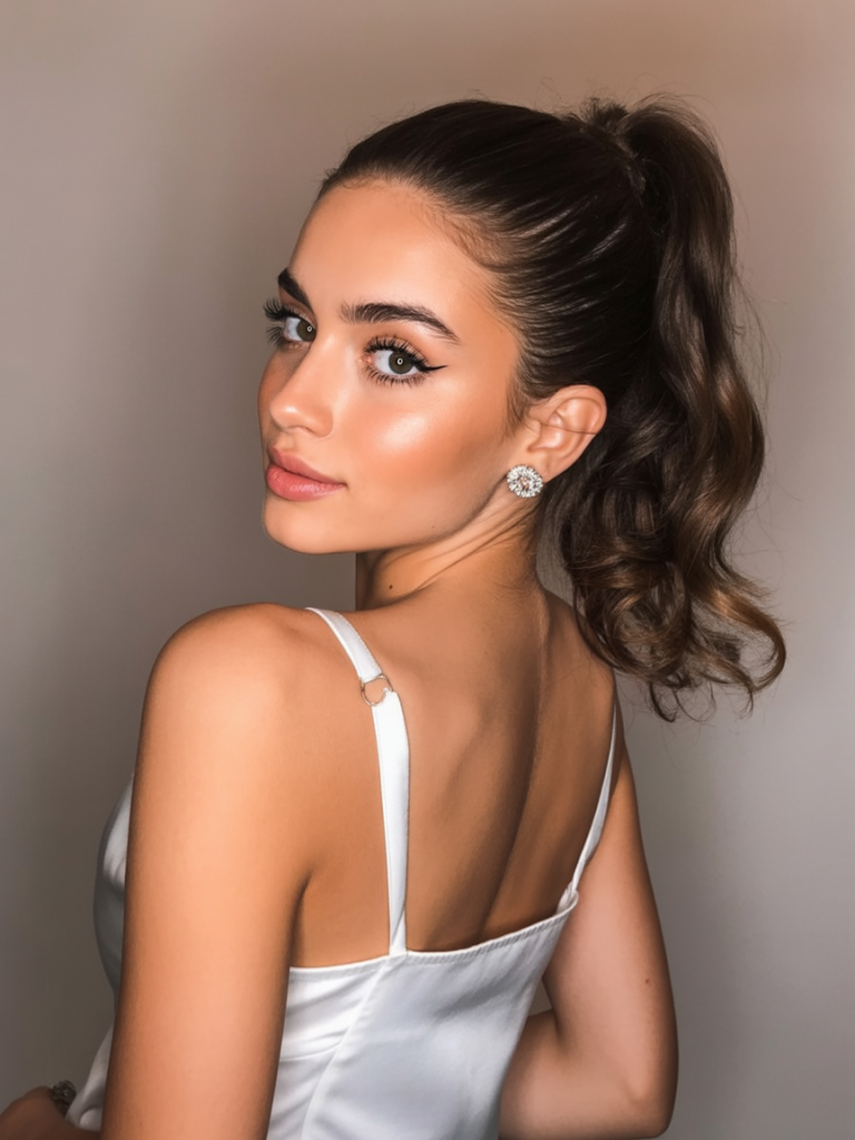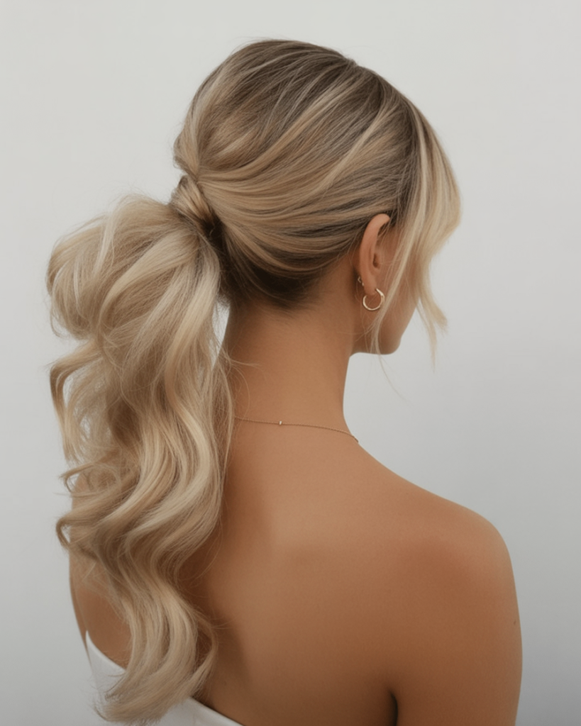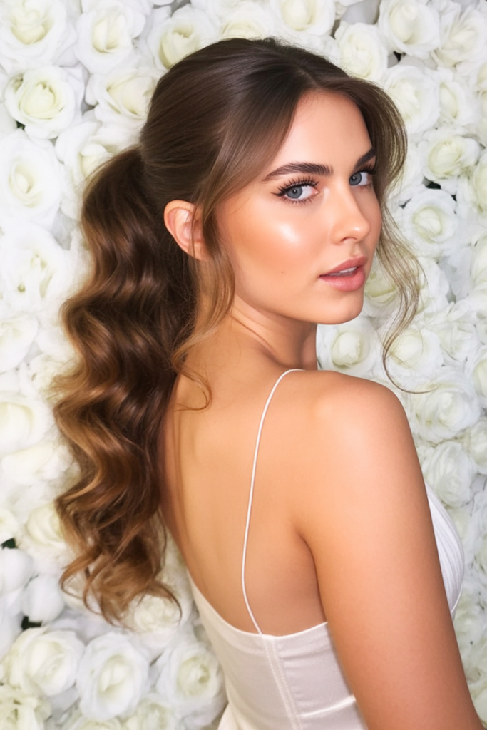 This is a glamorous ponytail for a wedding, featuring cascading curls that are gentle and elegant. This is a hairstyle that seems both elegant and beautiful, and it’s perfect for weddings and evening events. The shine, the dimension, and the movement will turn every head, and it will look fantastic from every angle.