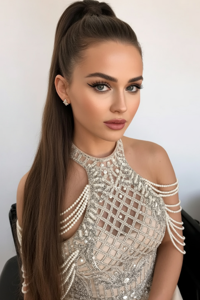 The sleek look of a high ponytail, along with elegant shine accessories, is the essence of modern class. The shining locks fall flat, straight, forming a sleek look that matches bold fashion, such as red dresses, well-defined accessories, and so on. This style exudes confidence along with a classic look.