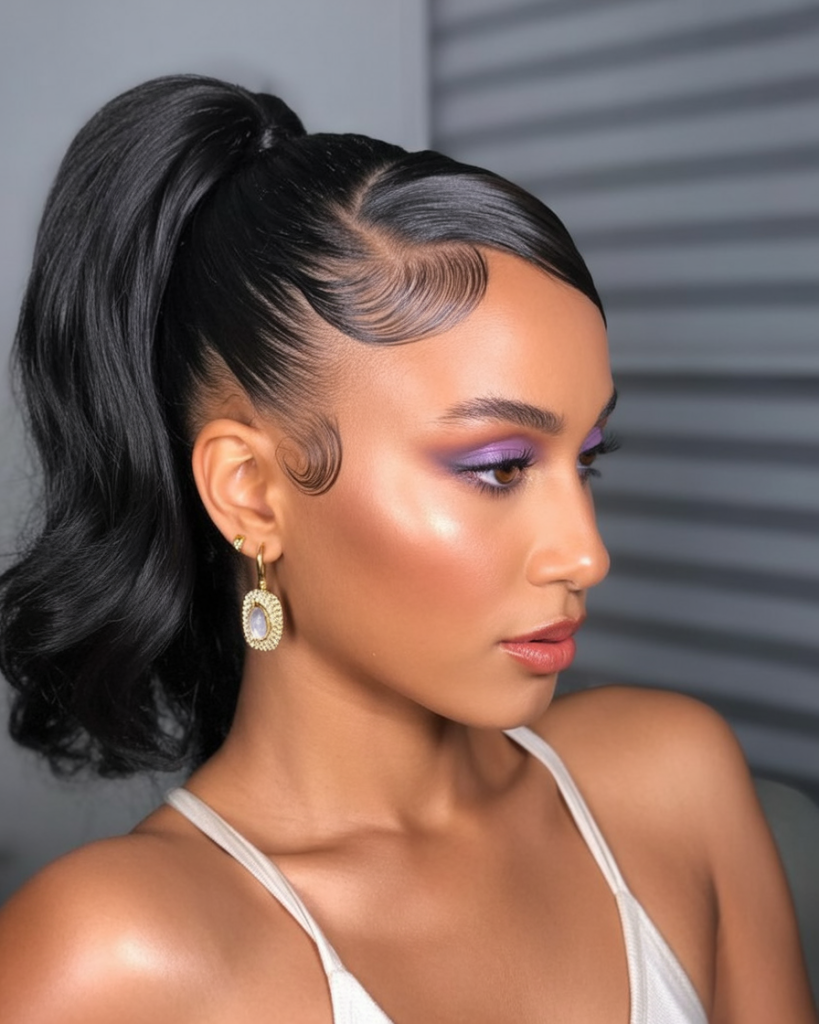 7. Sleek Ponytail with Curly Side Edges
