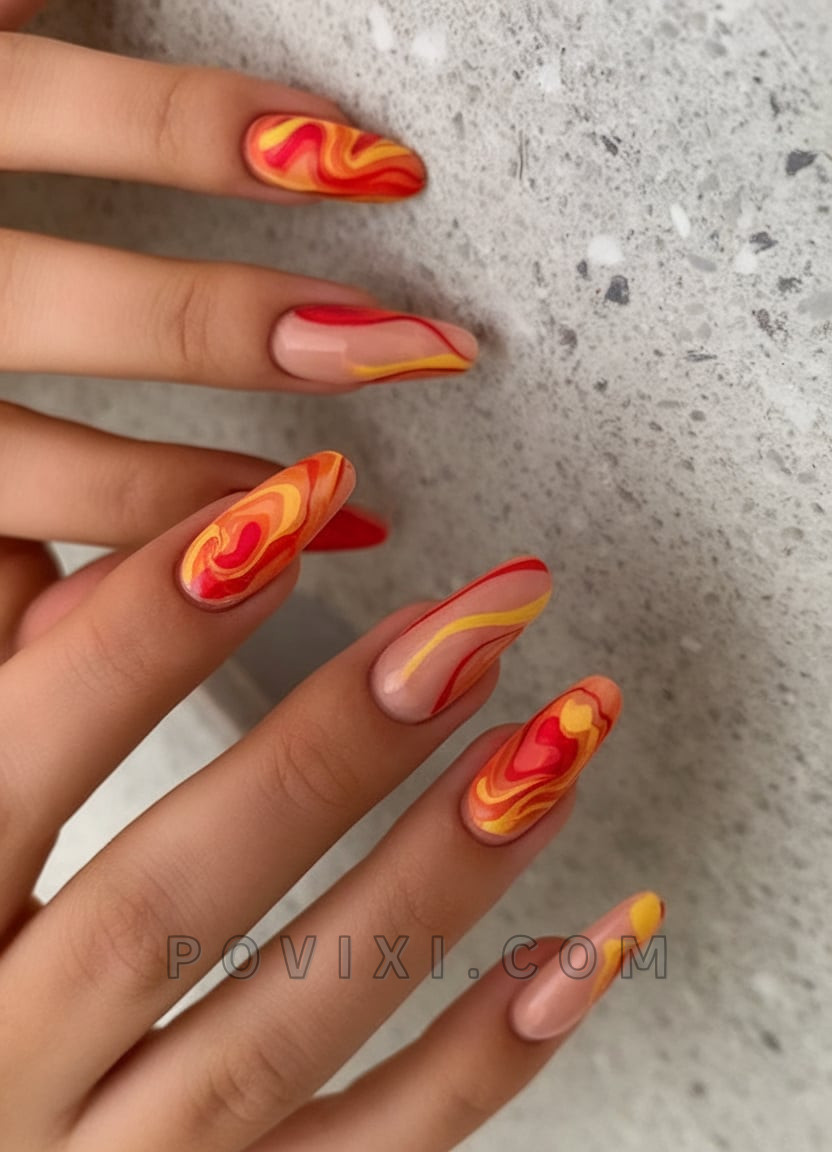 This unique nail design draws its power from the sunset fire of the desert. Red and tangerine orange combine with yellow to create mesmerizing patterns in almond-shaped gel nails that look like a lava lamp. Bold fashion enthusiasts should consider this trendy look that expresses hot summer nights in vibrant colors. The 2025 gel dnd colors stand out instantly and are a perfect match for those with darker skin tones as their vibrancy enhances warm foundation colors. Pair this style with a maxi dress and bold gold accessories for a beach-ready look.