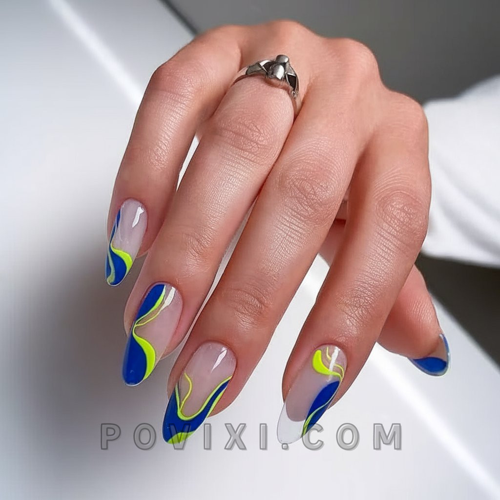 Channel the ocean with electric blue and lime green swirls on a clear base. Gel nails offer clients contemporary versions of traditional French tips. This design works exceptionally well on toes and delivers a strong visual impact, but requires a confident spirit. This edgy nail design features almond shapes and high energy, perfect for boat rides or festivals and night events. The ocean-inspired look is enhanced when paired with silver or cool accessories.