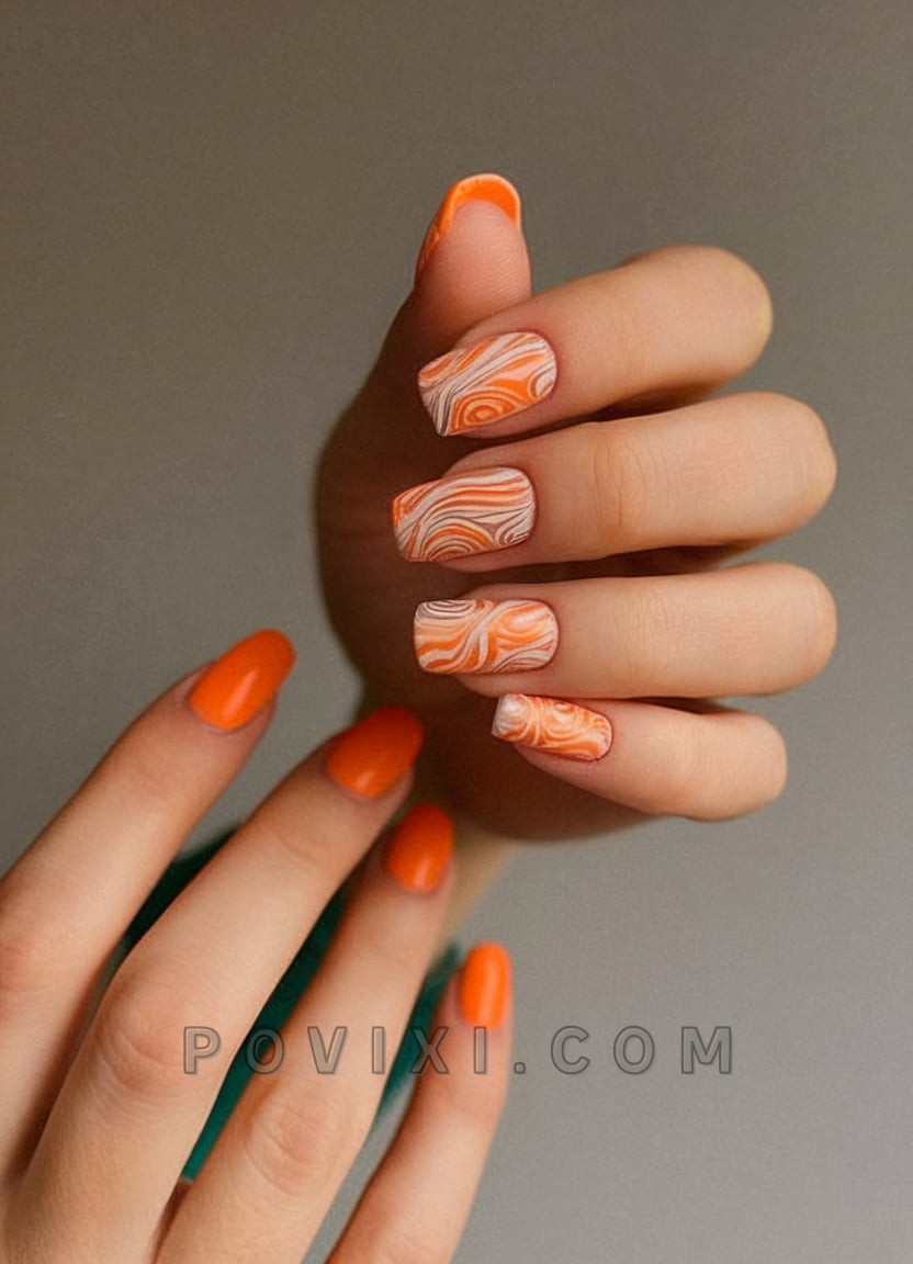 Triangular orange nails are a top choice for people who prefer intense and bright nail designs. Multiple fingernails feature an intricate marbled pattern, while solid orange nail art adds extra energy. The nail style is perfect for beach and pool occasions, yet blends perfectly with bronze skin tones, creating an ideal look for those with darker complexions. Dip nails strike the ideal balance between the exciting summer trends of 2025.