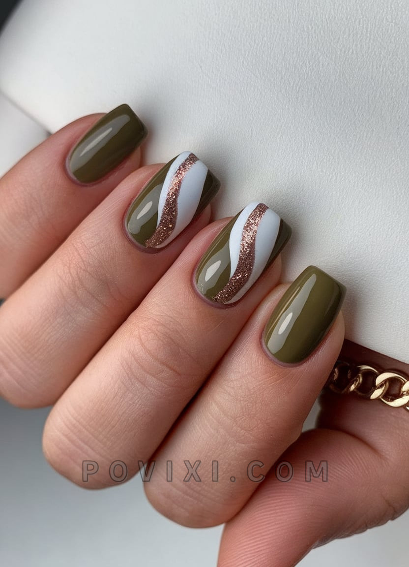 Olive green nails are part of the 2025 earthy trend that stands out from the usual boring styles. The square gel nails contain metallic rose gold and creamy white diagonal stripes for a sophisticated yet unconventional look. Olive green and white gold tones enhance pale skin by complementing each other perfectly. Wear gold jewelry and neutral clothing for the most elegant look when wearing this style.