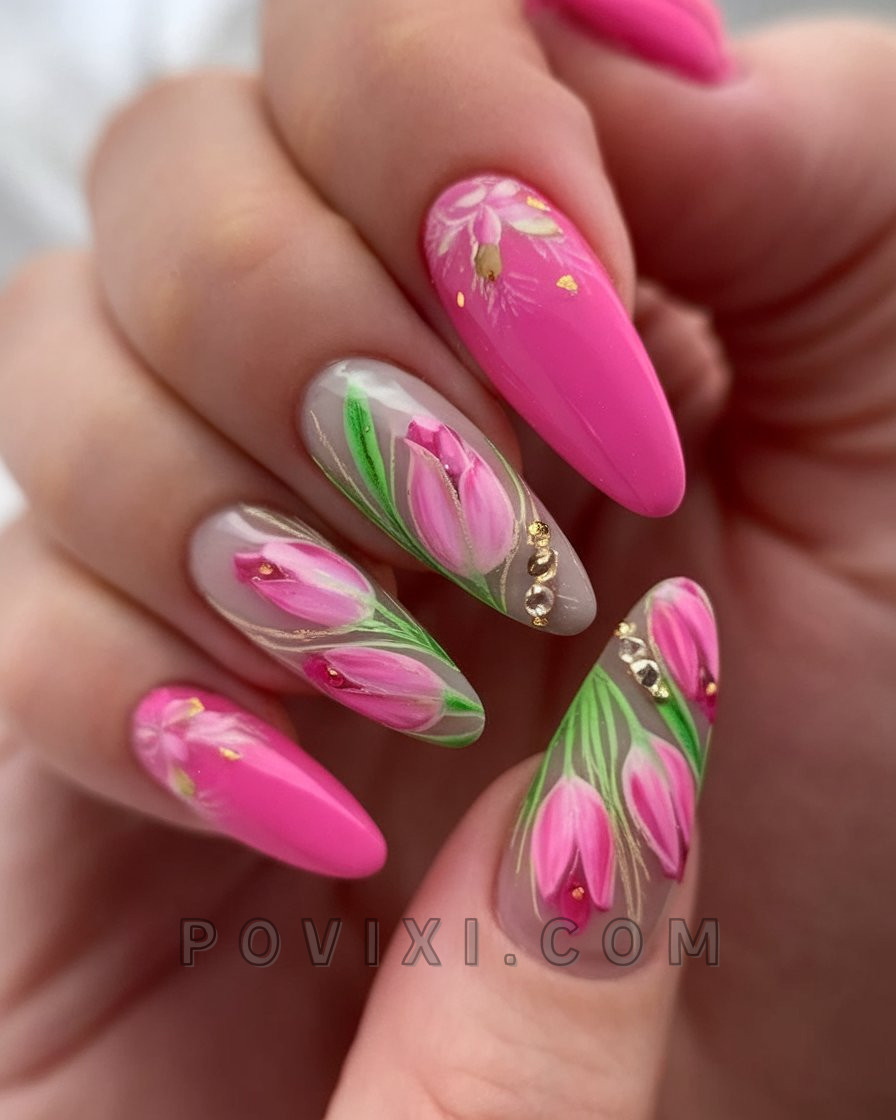 This stunning gel nail creation in vibrant pink with 3D tulip petals will be the center of attention if you have a summer aesthetic preference for flowers. Enhanced with gold foil and rhinestone embellishments, this design is elegant yet extravagant and extremely feminine. These nails form almond-shaped fingers with a romantic appeal that matches garden party attire. Because of its artistic quality, this unique design is one of the top floral nail designs for 2025.