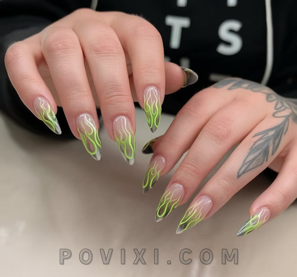 These edgy, ethereal flame-tipped nails are a bold rave fashion statement that brings the drama of high summer to life. The see-through base shows off the neon green while the pointed stiletto shape creates an intense dramatic effect. The flame-effect gel design works well for concert or beach-club party wear and complements both light and dark skin tones. Pair with metallic or neon accessories for a totally on-trend look.