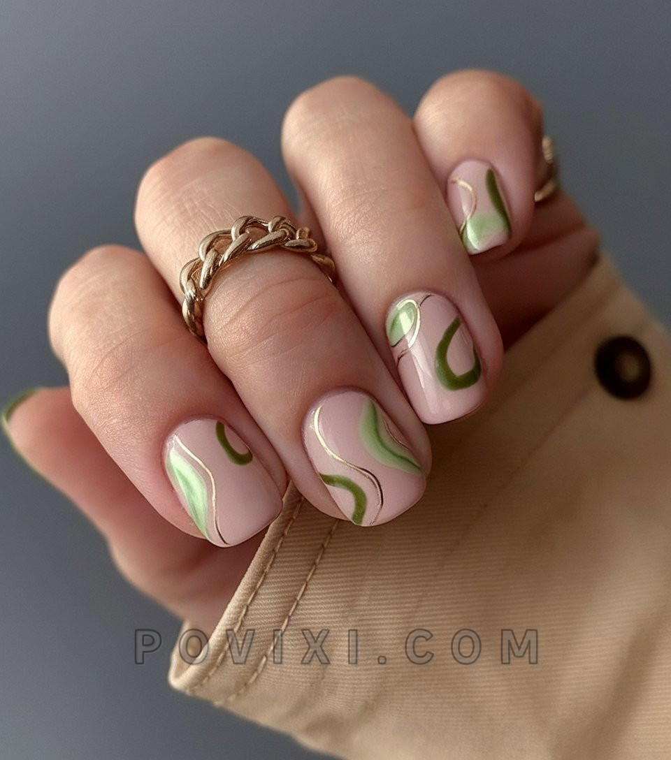 Pale blush foundation with a tranquil green swirl pattern showed light, sophisticated movement across its surface. Short round nails presented a simple modern touch with the abstract interpretations of sage and gold. Such natural nail art works perfectly with a simple yet elegant style for understated style queens. Kick off the summer with bright dresses and subtle jewelry to match your pale pink look.