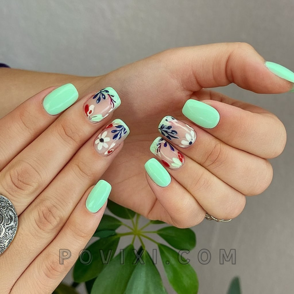 Bright mint polish pairs perfectly with hand-drawn floral patterns in navy, red and white. This playful approach offers a fresh pairing that has a natural feel as well as 2025 trend characteristics. Square nails showcase this design at its best, as it works well with light complexions by providing vibrant color that stays even without overpowering the look. This shade is perfect for sundresses and picnic blankets.