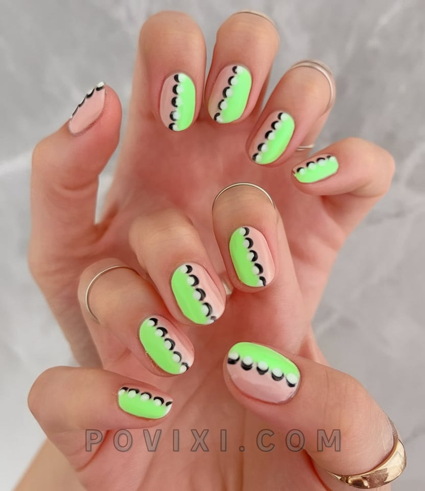Neon green nail polish creates one half of a color block presentation, while black and white scallops frame the edges of the manicure. Yes, please. Nails decorated with this edgy short gel design create an exploded style that adds playful color to your look. People who like to be daring can make the perfect statement with this innovative and bold design. Your nails will make a memorable impression no matter what you wear because this design is vibrant.