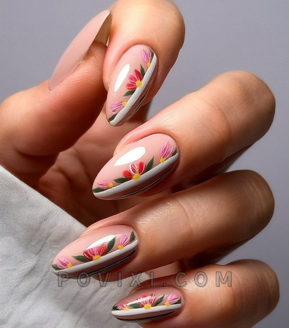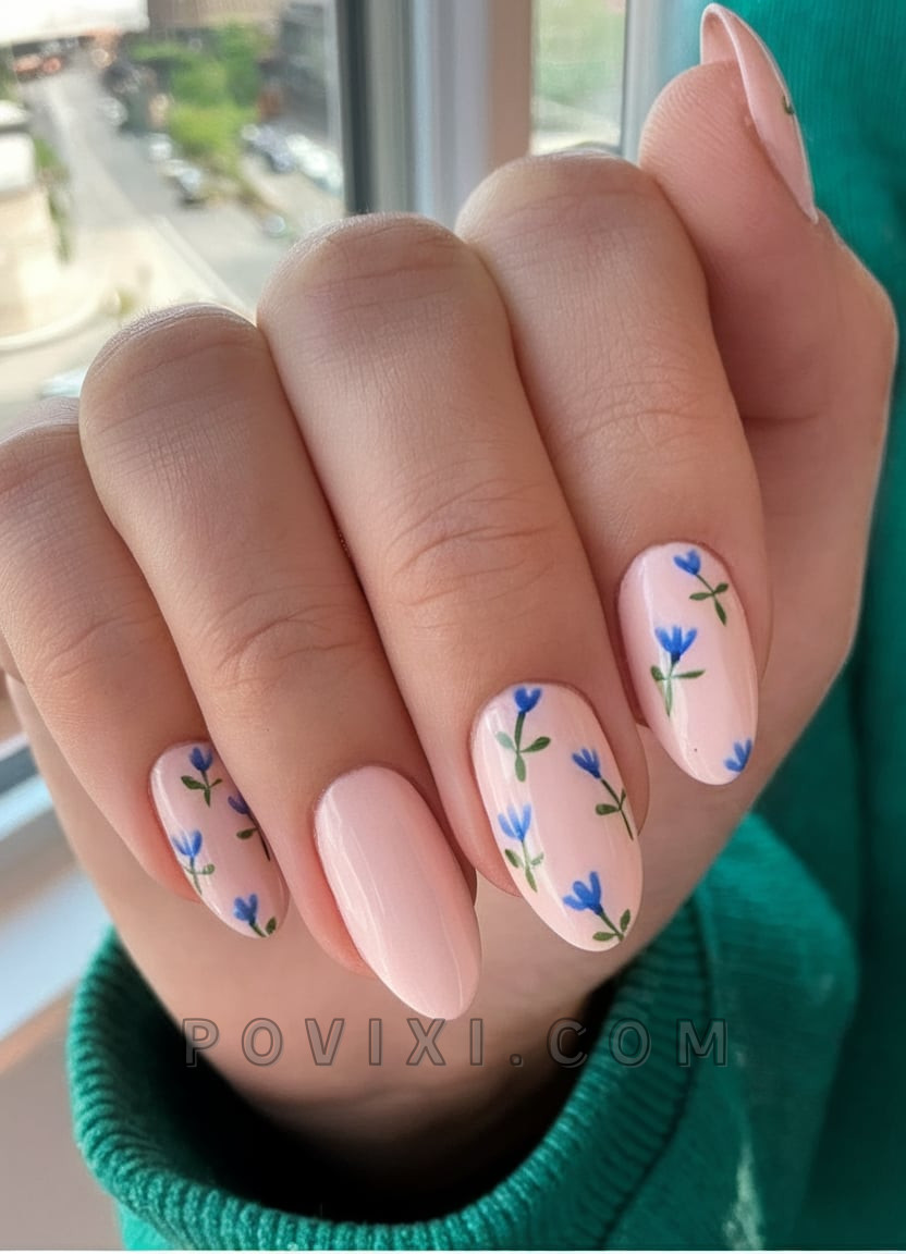 Minimalist flower nails with a baby pink base feature blue tulip-shaped buds along green leafy stems for an elegant style. This nail design from the 2025 Best of category works well with oval shapes and manages to combine light and bold elements. These nails combine artistic intent with natural elegance, making them suitable for daytime garden parties as well as baby shower events. Wear with a wind-blown white dress with blue accents for a complete look.