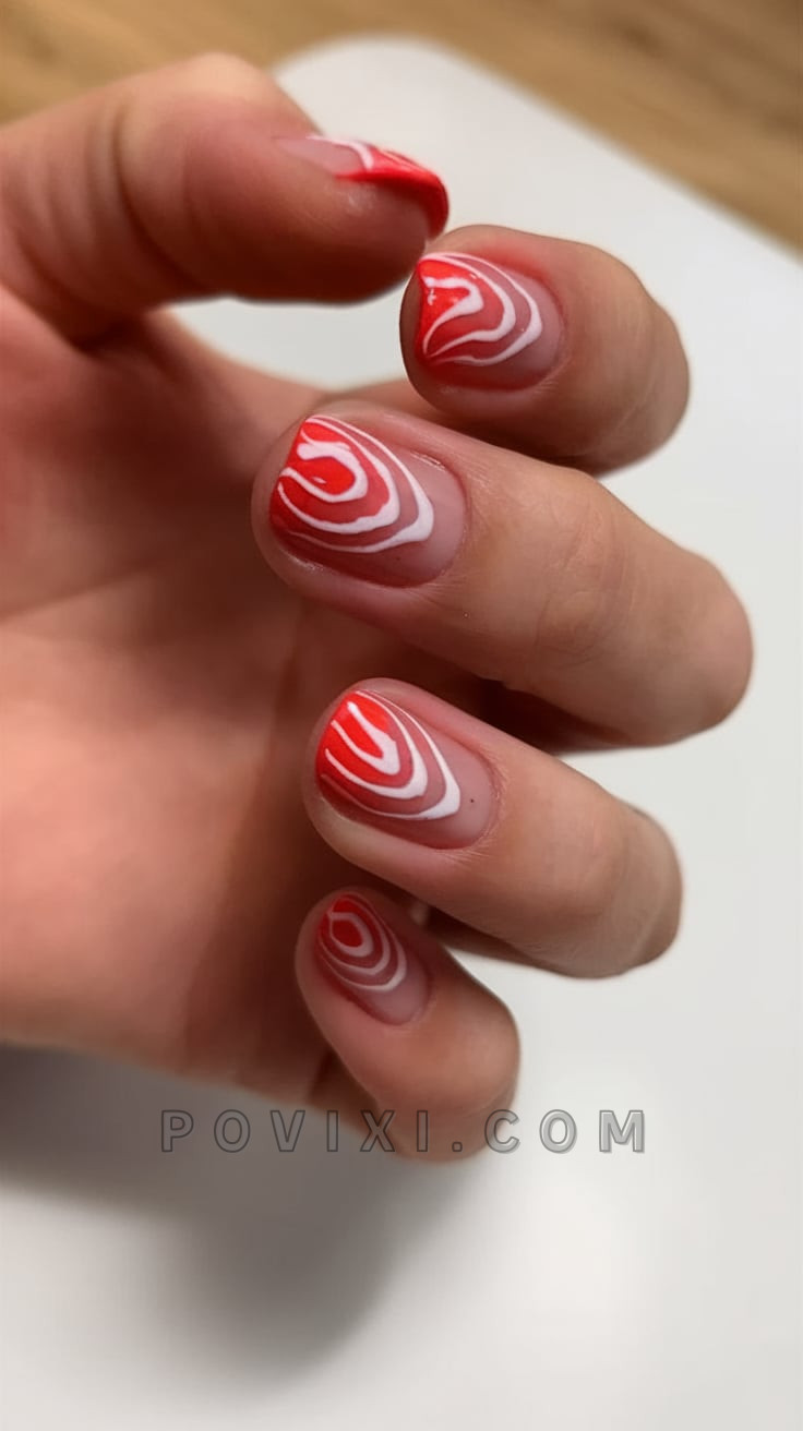These natural short nails feature a red and white lollipop-style spiral on a nude base, twisting the classic swirl design. These 2025 gel nails present a clean appeal with cuteness and freshness, making them suitable for everyday wear. Minimalist nail types get a sweet touch with this style, which is perfect for those who prefer understated designs. Complete the look with casual pants that pair well with red lips for a soft summer chic ensemble.