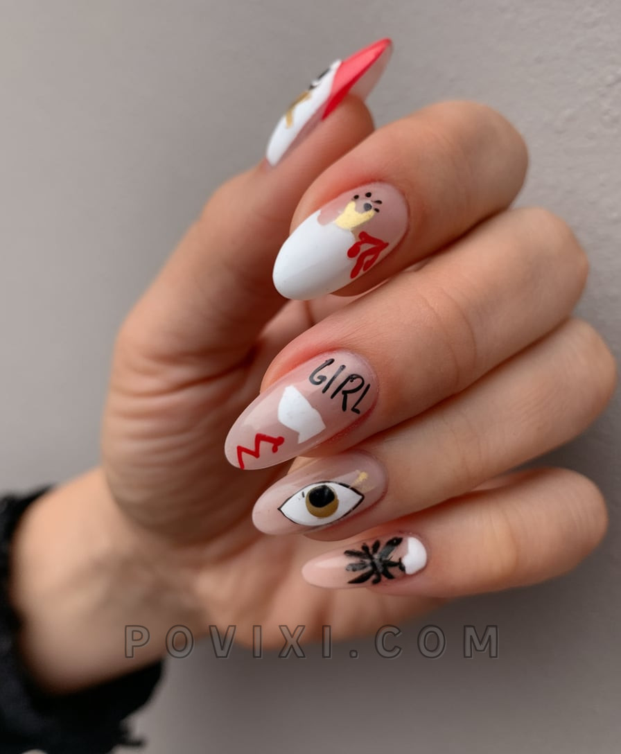 Almond-shaped nails serve as the foundation for artistic creations that adorn the fingertips. Abstract designs with layered lines and white and red-black accents on these nails create a striking artistic look. The style works magic for women who enjoy taking risks with bold, edgy gel nails. Among these nails stands out an eye drawing, which shows perfect style for creative women. Such a design perfectly matches minimalist gold accessories and black ensemble apparels. Dark complexioned and fair-skinned individuals will find this design equally attractive due to its complementary color scheme.