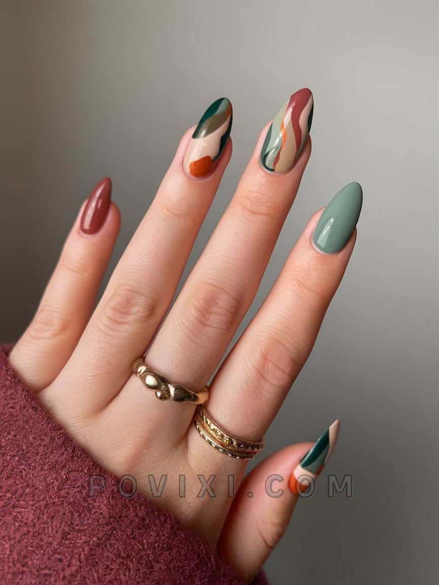 Earth tones transcend their association with the fall season. Modern swirl patterns present this almond set by merging deep navy and terracotta with sage tones. This nail design combines strength and practicality to create transitional styles suitable for summer days to fall nights. The acrylic nail design looks most appealing with gel or dip powder techniques while wearing voluminous accessories along with a billowing burgundy kimono.