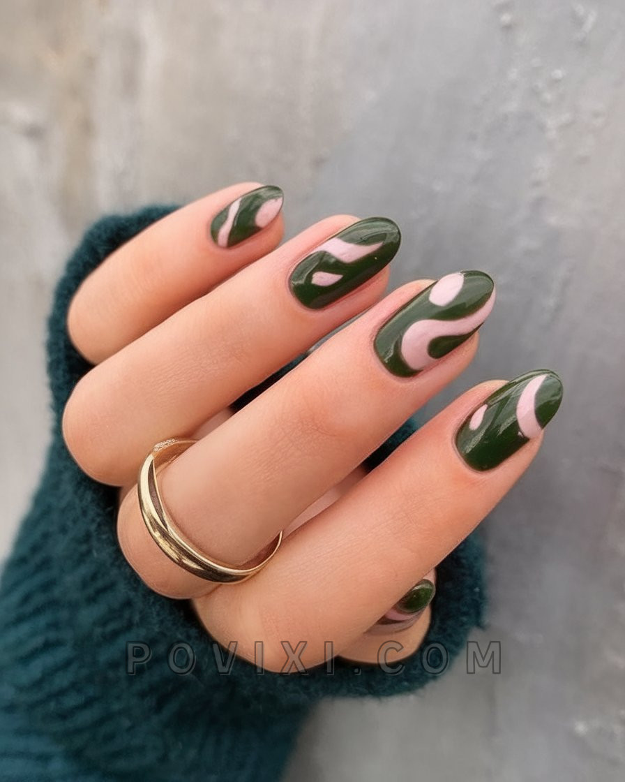 Natural nails are given a fresh style by applying fluid, organic olive green patterns over a nude base. The manicure offers a contemporary appeal without being overwhelming, while providing a refined, subtle look. The flowing shapes in this manicure complement all nail shapes, including short and oval, creating an elegant hand look. These extraordinary dip nails go well with any outfit from flowing casual dresses to oversized blazers.