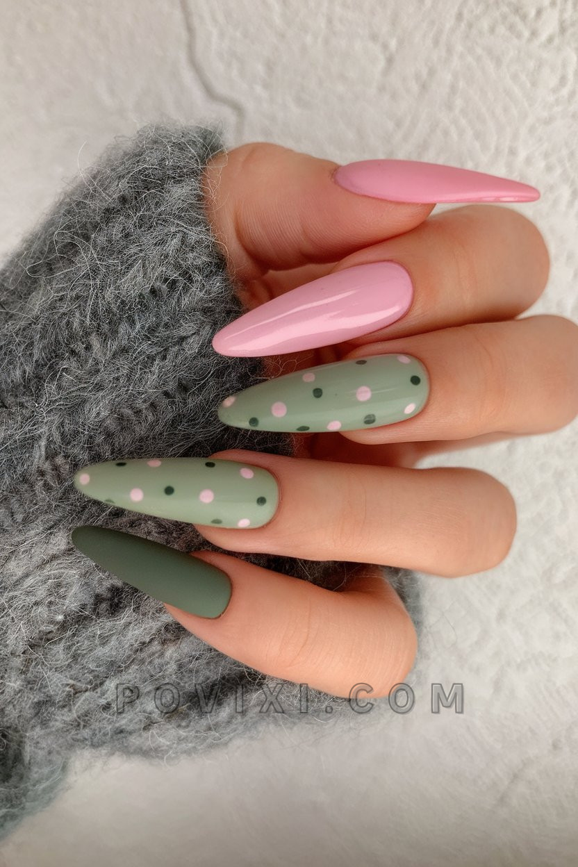 The combination of matte and glossy finishes in this nail design creates a bright, vibrant appeal that adds an extra dimension. The combination of pastel green with pink polka dots creates a delightful summer atmosphere that stands out as the main attraction. Long, almond-shaped nails add an extra touch to 2025 Gel dnd or 2025 Dip applications. Wear this artistic nail design with cropped tops and midi skirts for a picnic in the park aesthetic.