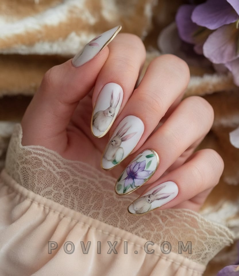 This design looks like it belongs in a fairy tale kingdom. The nail artist uses soft white bases followed by gold edges that showcase hand-painted bunnies or floral designs per nail. The delicate and nostalgic aspect along with the elegant features make this manicure perfect for people who are attracted to light pastels and appreciate feminine design on their nails. This manicure looks best on oval and square nail shapes and works best on pale complexions. Complement this look with lace blouses that match flowing chiffon gowns.