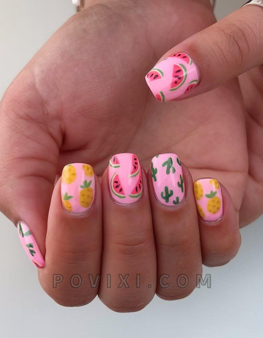 The striking pink accented manicure is truly unique with the artist-created watermelon shapes and pineapple details and miniature cactus effects. The square nail design creates easy-to-access summer trends that are perfect for tropical getaways and cocktail lovers. The eye-catching gel nails demand both flip-flops and a beach bag due to their bold and colorful nature.