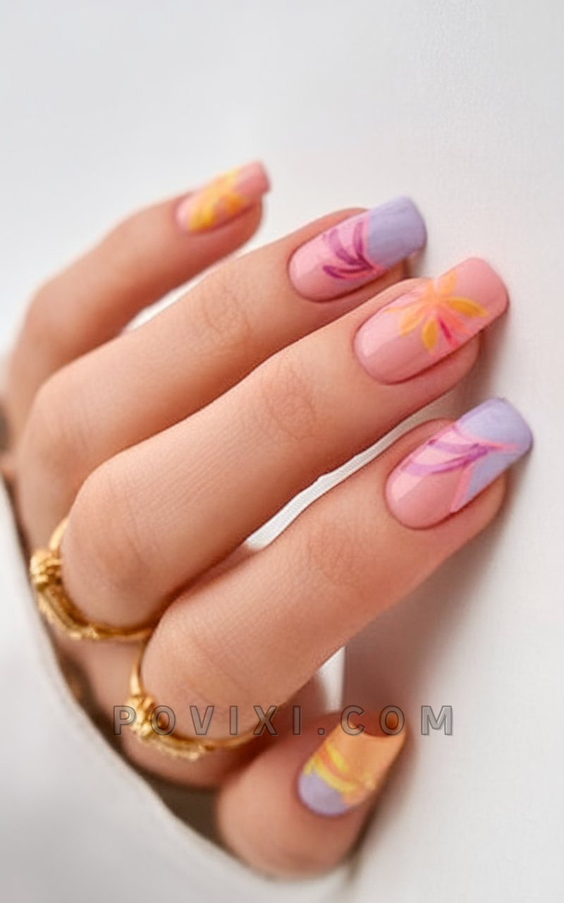 These squoval nails channel the mood of peaceful sunset moments through their combination of lavender, peach and pink blocks with leaf and floral accents. The understated look delivers a sophisticated message that qualifies this style as an elegant choice. From intimate events to outdoor soirees, this nail style remains appropriate for both scenarios. This manicure is perfect for short to medium length nails, especially if they are natural.
