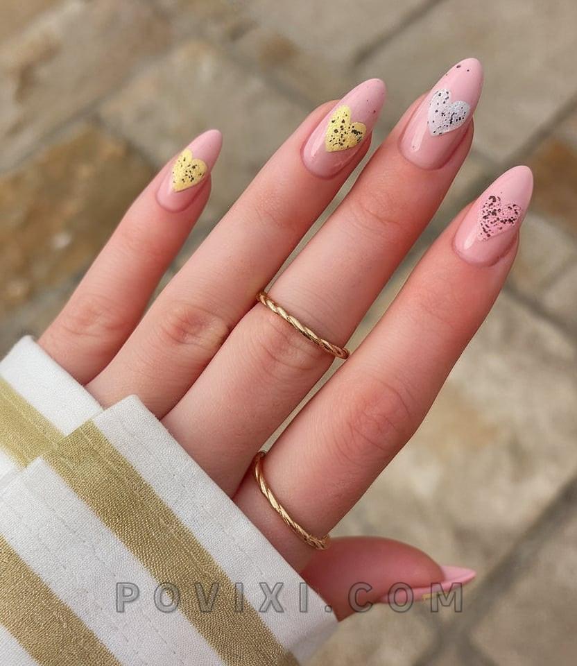Romantics will love this sweet manicure, a popular choice for 2025. Almond-shaped nails are adorned with a light pink polish containing glittering hearts in soft shades of white, coral and yellow. The nail decorations have enough light reflection to catch sunlight, but maintain a level of minimalism for regular everyday use. The design works equally well on both light and dark skin tones, making it suitable for all users.