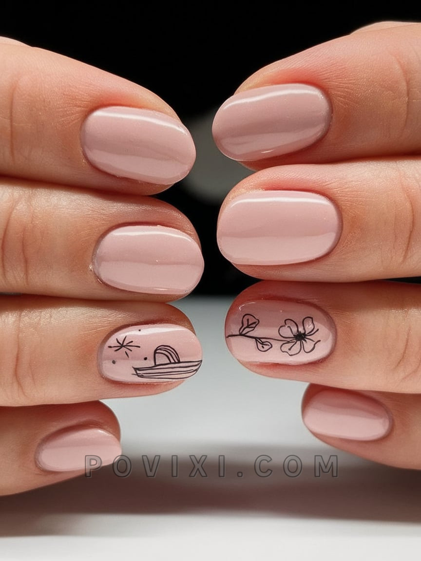 A person who appreciates minimalist styles will adore these round and short nail designs. The base of glossy nude nail polish provides a shell for black line art that includes both a flower branch and a miniature rainbow skyline. The design presents a sophisticated look that fits the 2025 natural nail trend. Works beautifully with monochrome outfits or clean white shirts and jeans.