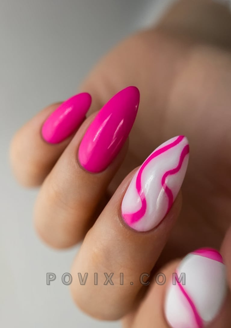 This combination of bright pink and wavy white patterns delivers a fresh revival of 2000s style with a 2025 edge. The almond-shaped nail length works with two styles at once, while making a strong statement with its modern abstract designs that enhance colored nails. This 2025 gel design, with its bright fuchsia base, is the perfect pool party style that looks vibrant in the sun and works for all light- to medium-skinned individuals. Barbiecore blends with edgy sophistication in this design.