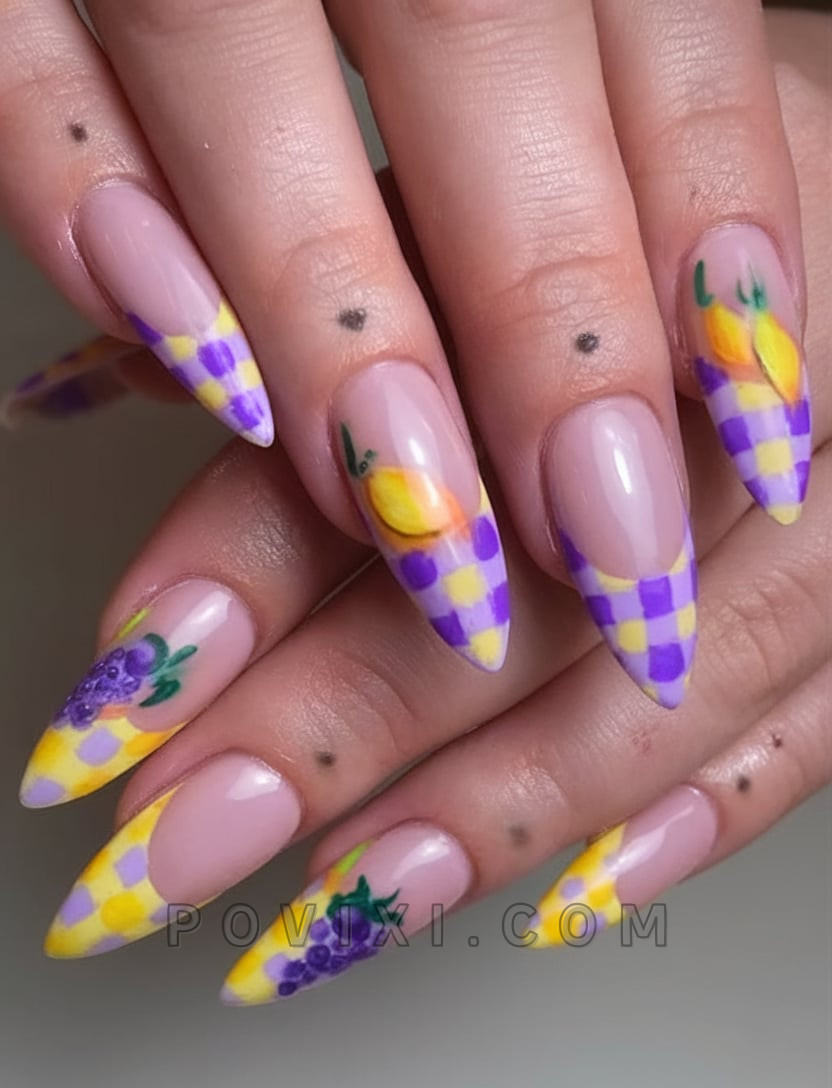 This acrylic nail kit showcases summer farmer’s markets with delightful hand-drawn lemon and grape designs combined with retro yellow-purple gingham patterns. The detailed design creates both a charming and nostalgic atmosphere with trendy undertones. People with oval or almond shaped nails will find perfect harmony with these 2025 dip designs designed for maximalists. These nails are ideal for summer barbecues and girl group outings and work well with both gingham and denim overalls.