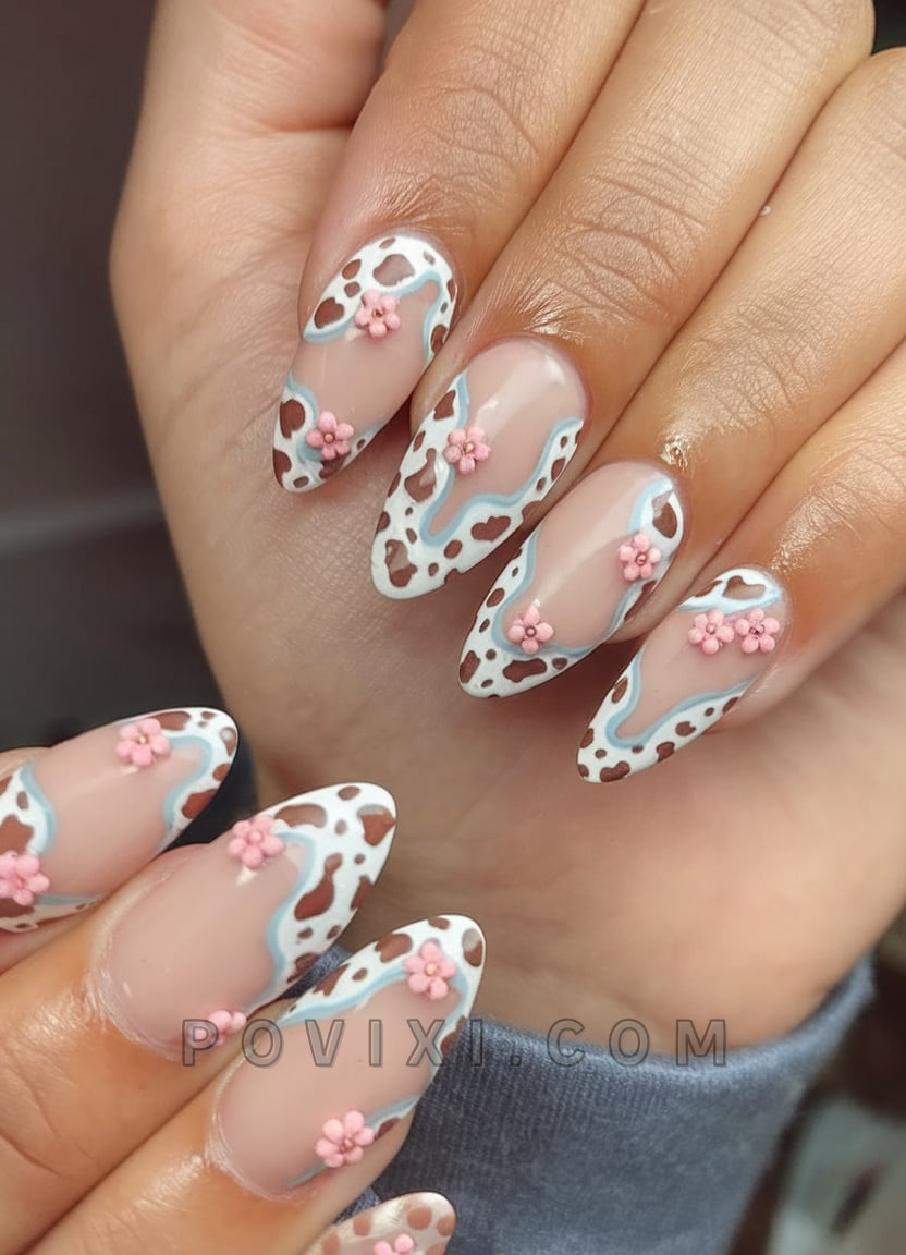This nail design blends western elegance with country beauty by combining a cow print background with soft blue swirls and tiny pink 3D flowers. The layout of this design teaches students to combine playfulness with elegance at its best. Natural or dip nails become perfect storytelling elements as this creative 2025 nail design demands absolute originality. Wear a vintage floral dress with boots for a rodeo runway inspired style.