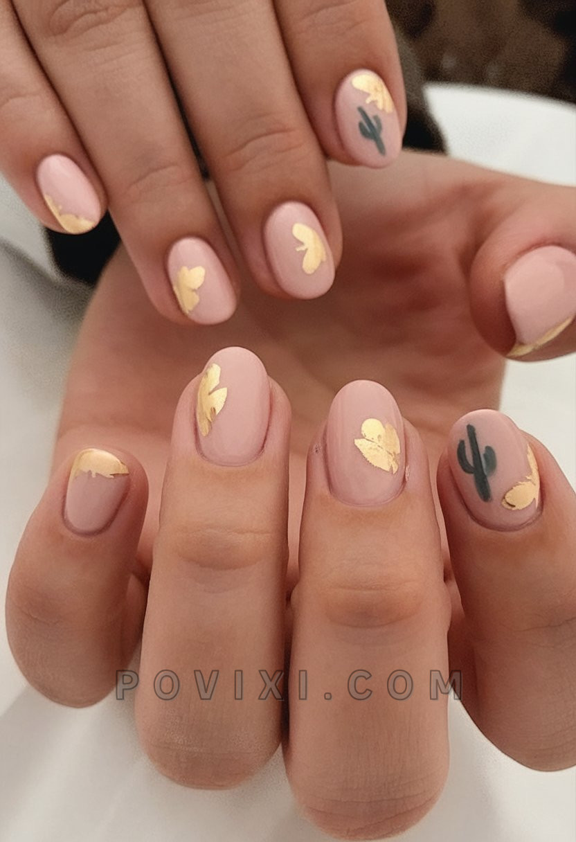 Short, round nails painted with blush nude polish get a finishing touch with gold foil butterflies and earthy green cacti. These delicate stones make a subtle yet rich statement. This nail design is reminiscent of Arizona summer days, making it suitable for those with pale skin tones and neutral color schemes. The soft, elegant look of these nails creates both an office-ready and fashionable western style. Dnd colors provide extra luxury points when used in this design. Pair linen pants with sandals and a straw tote for an ideal choice for a relaxing weekend getaway.